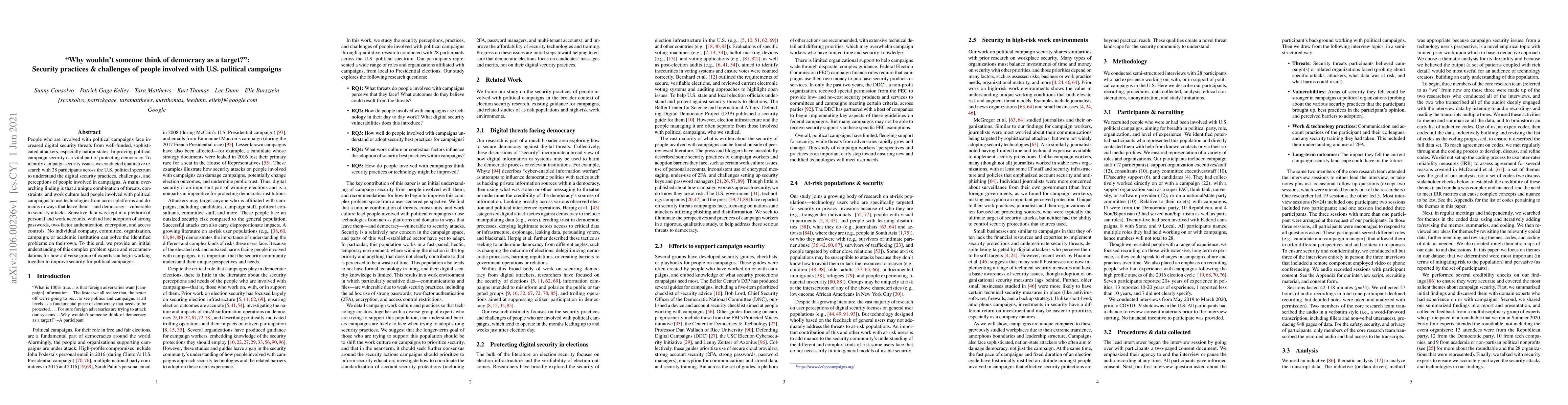 People who are involved with political campaigns face increased digital security threats from well-funded, sophisticated attackers, especially nation-states. Improving political campaign security is a vital part of protecting democracy. To identify campaign security issues, we conducted qualitative research with 28 participants across the U.S. political spectrum to understand the digital security practices, challenges, and perceptions of people involved in campaigns. A main, overarching finding is that a unique combination of threats, constraints, and work culture lead people involved with political campaigns to use technologies from across platforms and domains in ways that leave them--and democracy--vulnerable to security attacks. Sensitive data was kept in a plethora of personal and work accounts, with ad hoc adoption of strong passwords, two-factor authentication, encryption, and access controls. No individual company, committee, organization, campaign, or academic institution can solve the identified problems on their own. To this end, we provide an initial understanding of this complex problem space and recommendations for how a diverse group of experts can begin working together to improve security for political campaigns.