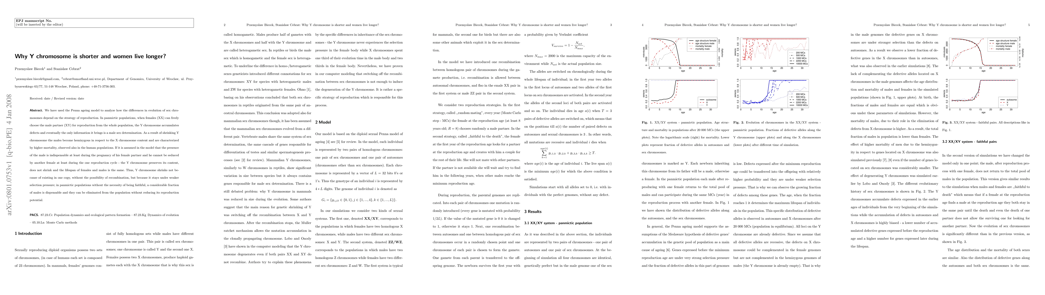 This paper uses the Penna ageing model to analyze how the Y chromosome's evolution leads to its shorter length and higher male mortality, attributing this to the evolutionary strategy of panmictic populations where males are often expendable. It concludes that if males are indispensable during reproduction, the Y chromosome remains stable, equalizing lifespans between sexes.