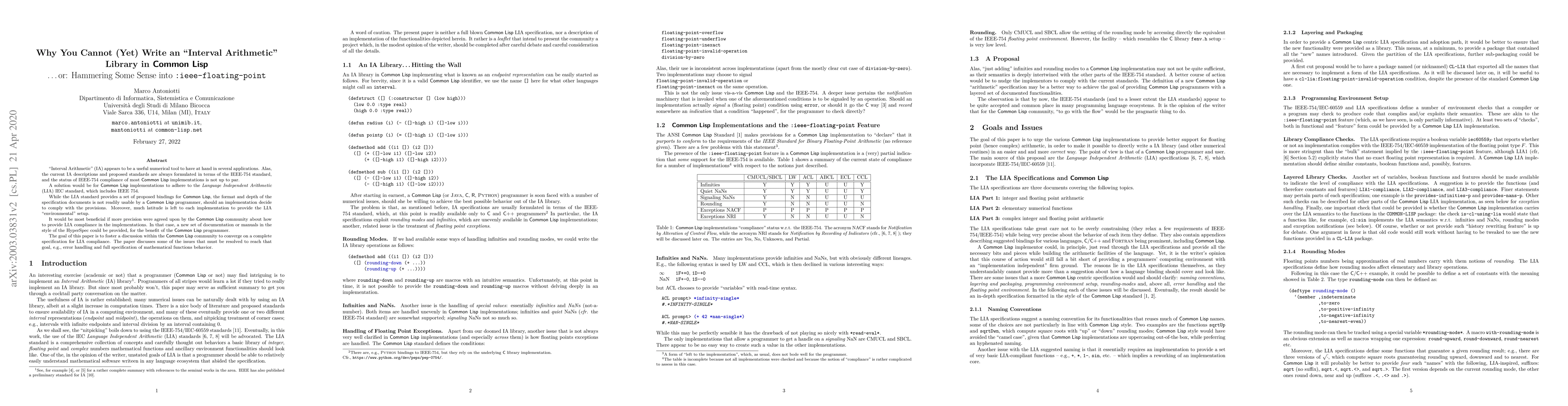 The paper discusses the challenge of implementing Interval Arithmetic (IA) in Common Lisp due to the lack of IEEE-754 compliance in most Common Lisp implementations. It suggests that adhering to the Language Independent Arithmetic (LIA) IEC standard could solve this, but the current specification documents are not suitable for Common Lisp programmers. The paper advocates for more precise guidelines from the Common Lisp community to facilitate LIA compliance and the creation of corresponding documentation.