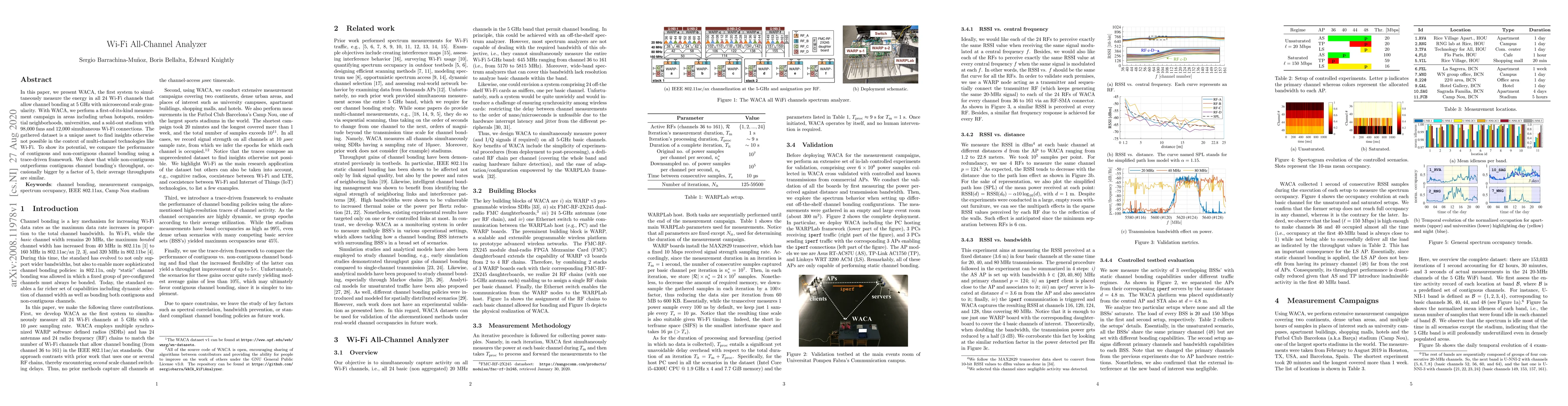 In this paper, we present WACA, the first system to simultaneously measure the energy in all 24 Wi-Fi channels that allow channel bonding at 5 GHz with microsecond scale granularity. With WACA, we perform a first-of-its-kind measurement campaign in areas including urban hotspots, residential neighborhoods, universities, and a sold-out stadium with 98,000 fans and 12,000 simultaneous Wi-Fi connections. The gathered dataset is a unique asset to find insights otherwise not possible in the context of multi-channel technologies like Wi-Fi. To show its potential, we compare the performance of contiguous and non-contiguous channel bonding using a trace-driven framework. We show that while non-contiguous outperforms contiguous channel bonding's throughput, occasionally bigger by a factor of 5, their average throughputs are similar.