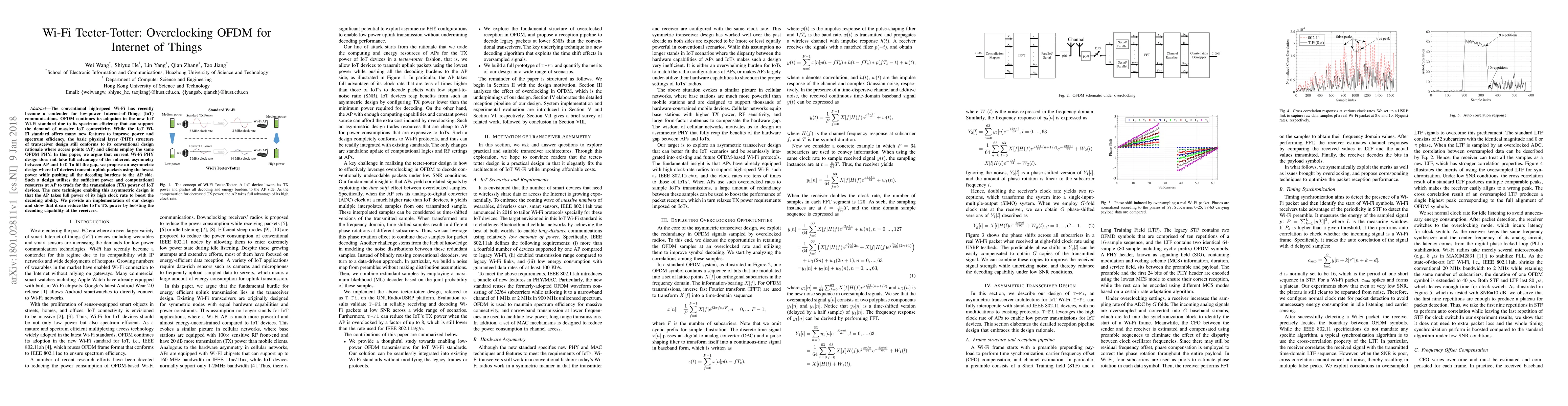 This paper proposes an asymmetric design for IoT Wi-Fi communication where IoT devices transmit with minimal power, offloading decoding tasks to powerful access points. The design leverages the high clock rate of access points to enhance decoding capabilities, thereby reducing IoT device transmission power.