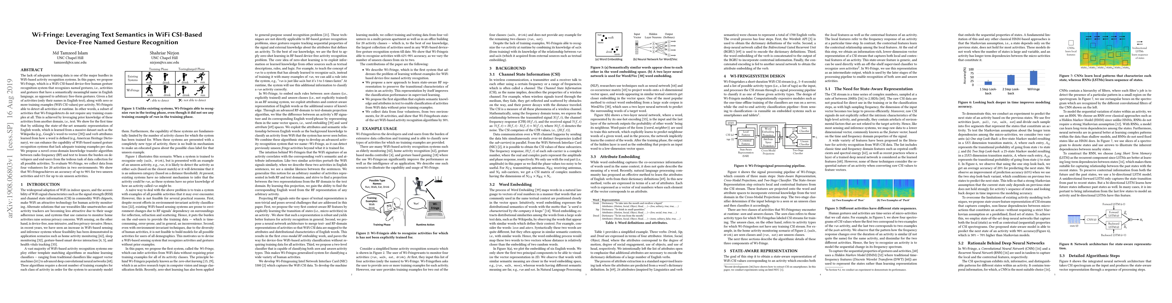 Wi-Fringe is a WiFi CSI-based system for device-free recognition of named human gestures using text semantics. It can detect activities from their names alone, even without any training examples, leveraging the semantic meaning of the gestures.