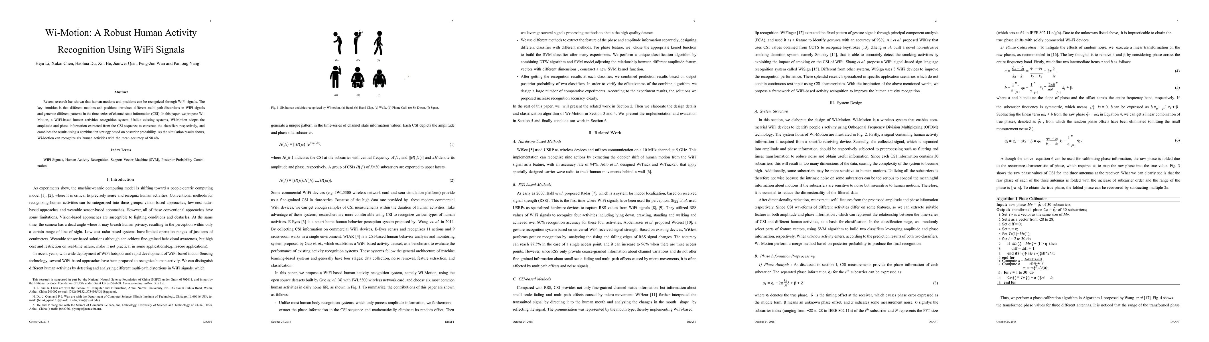 Wi-Motion is a WiFi-based human activity recognition system that utilizes amplitude and phase information from channel state information (CSI) to construct classifiers, achieving a mean accuracy of 98.4% in recognizing six activities. It combines classifier results using a posterior probability-based strategy for enhanced robustness.