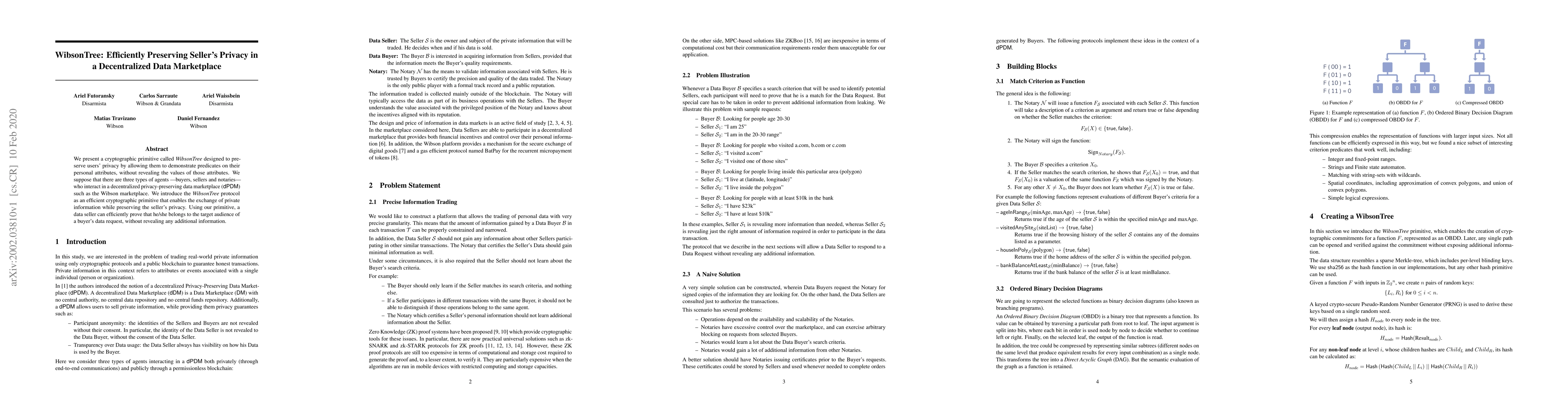 Summary: WibsonTree is a cryptographic primitive designed to maintain privacy in decentralized data marketplaces by enabling sellers to prove membership in a target audience without disclosing personal attributes. The WibsonTree protocol facilitates efficient, privacy-preserving interactions between buyers, sellers, and notaries in such marketplaces.