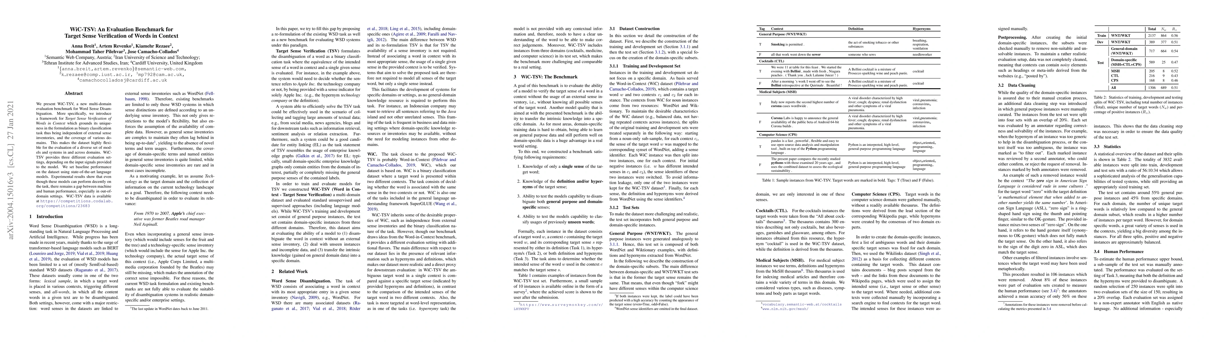 WiC-TSV is a new benchmark for evaluating Word Sense Disambiguation through Target Sense Verification, formulated as a binary classification task independent of external sense inventories. The dataset offers diverse evaluation settings and highlights the gap between machine and human performance, especially in out-of-domain contexts.