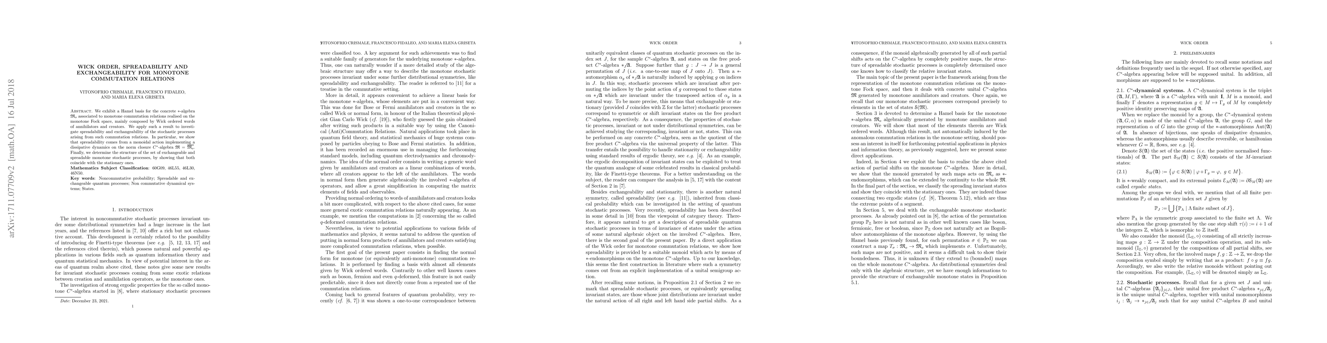 We exhibit a Hamel basis for the concrete $*$-algebra $\mathfrak{M}_o$ associated to monotone commutation relations realised on the monotone Fock space, mainly composed by Wick ordered words of annihilators and creators. We apply such a result to investigate spreadability and exchangeability of the stochastic processes arising from such commutation relations. In particular, we show that spreadability comes from a monoidal action implementing a dissipative dynamics on the norm closure $C^*$-algebra $\mathfrak{M} = \overline{\mathfrak{M}_o}$. Moreover, we determine the structure of spreadable and exchangeable monotone stochastic processes using their correspondence with sp\-reading invariant and symmetric monotone states, respectively.