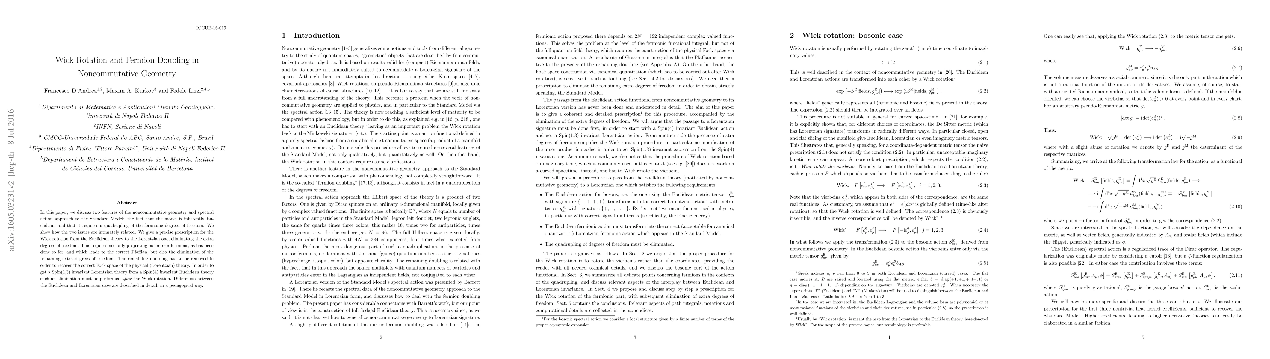 This paper explores the relationship between Wick rotation and fermion doubling in noncommutative geometry, demonstrating how to transition from an inherently Euclidean model to a Lorentzian one while eliminating unnecessary fermionic degrees of freedom to achieve a Spin(1,3) invariant theory. It details the process of projecting out mirror fermions and removing remaining extra degrees to recover the correct Fock space.