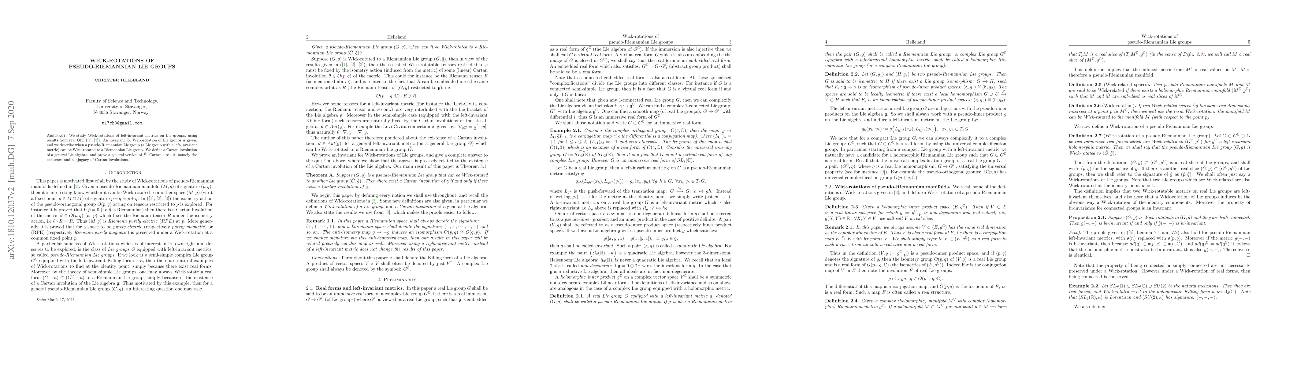 The novelty of this work lies in extending classical results about Cartan involutions to pseudo-Riemannian Lie groups, introducing an invariant for Wick-rotation, and proving a generalized version of Cartan's result applicable to general Lie algebras, thereby broadening the scope of understanding Wick-rotations beyond semi-simple cases.