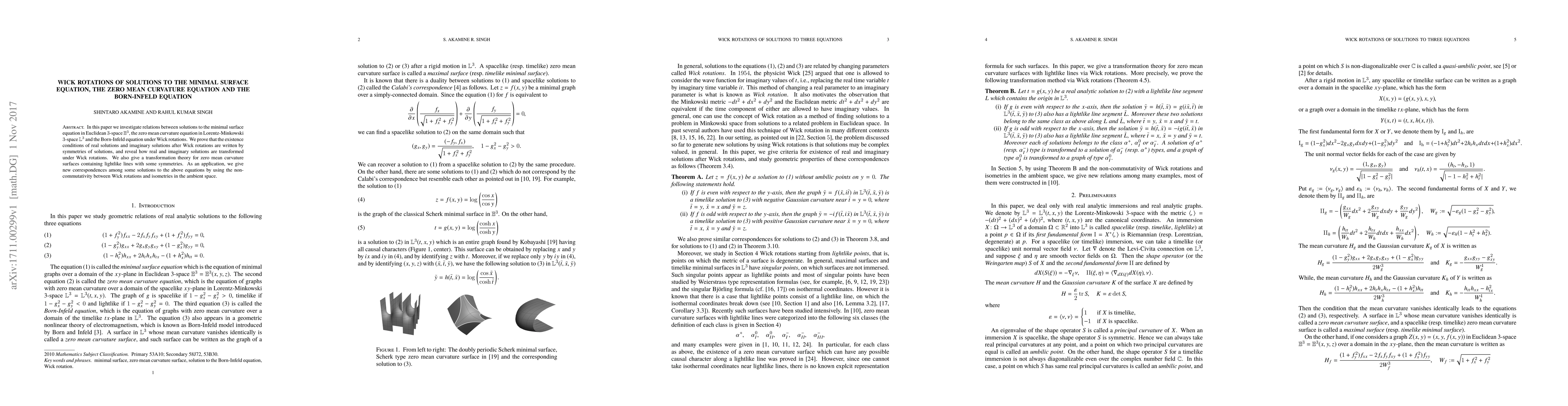 This paper explores the connections between solutions to the minimal surface, zero mean curvature, and Born-Infeld equations via Wick rotations, revealing transformations of real and imaginary solutions and providing a transformation theory for zero mean curvature surfaces with lightlike lines. It also demonstrates new correspondences among solutions using the interplay between Wick rotations and isometries.