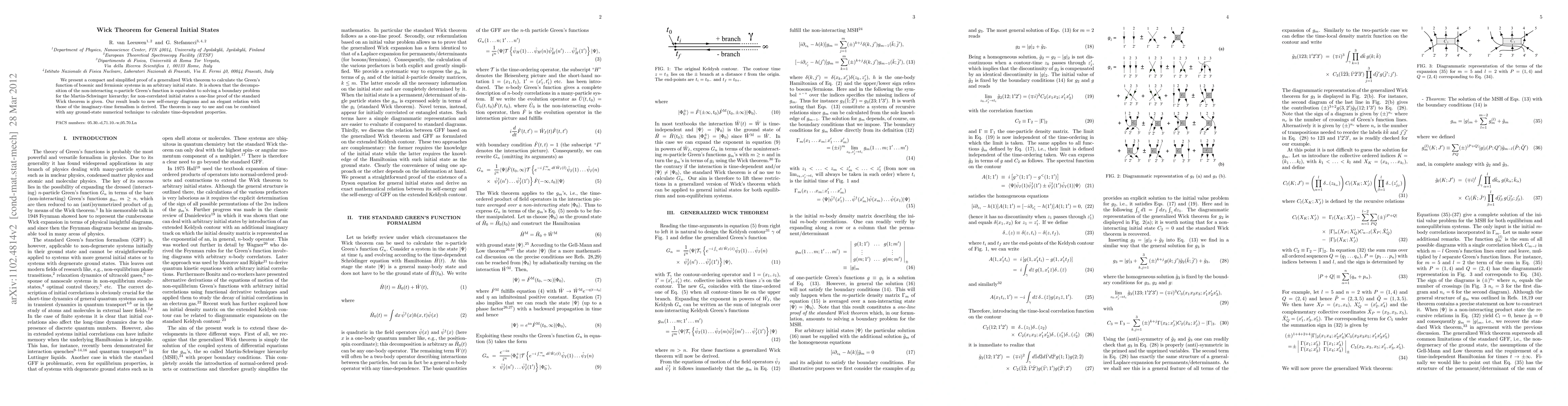 We present a compact and simplified proof of a generalized Wick theorem to calculate the Green's function of bosonic and fermionic systems in an arbitrary initial state. It is shown that the decomposition of the non-interacting $n$-particle Green's function is equivalent to solving a boundary problem for the Martin-Schwinger hierarchy; for non-correlated initial states a one-line proof of the standard Wick theorem is given. Our result leads to new self-energy diagrams and an elegant relation with those of the imaginary-time formalism is derived. The theorem is easy to use and can be combined with any ground-state numerical technique to calculate time-dependent properties.