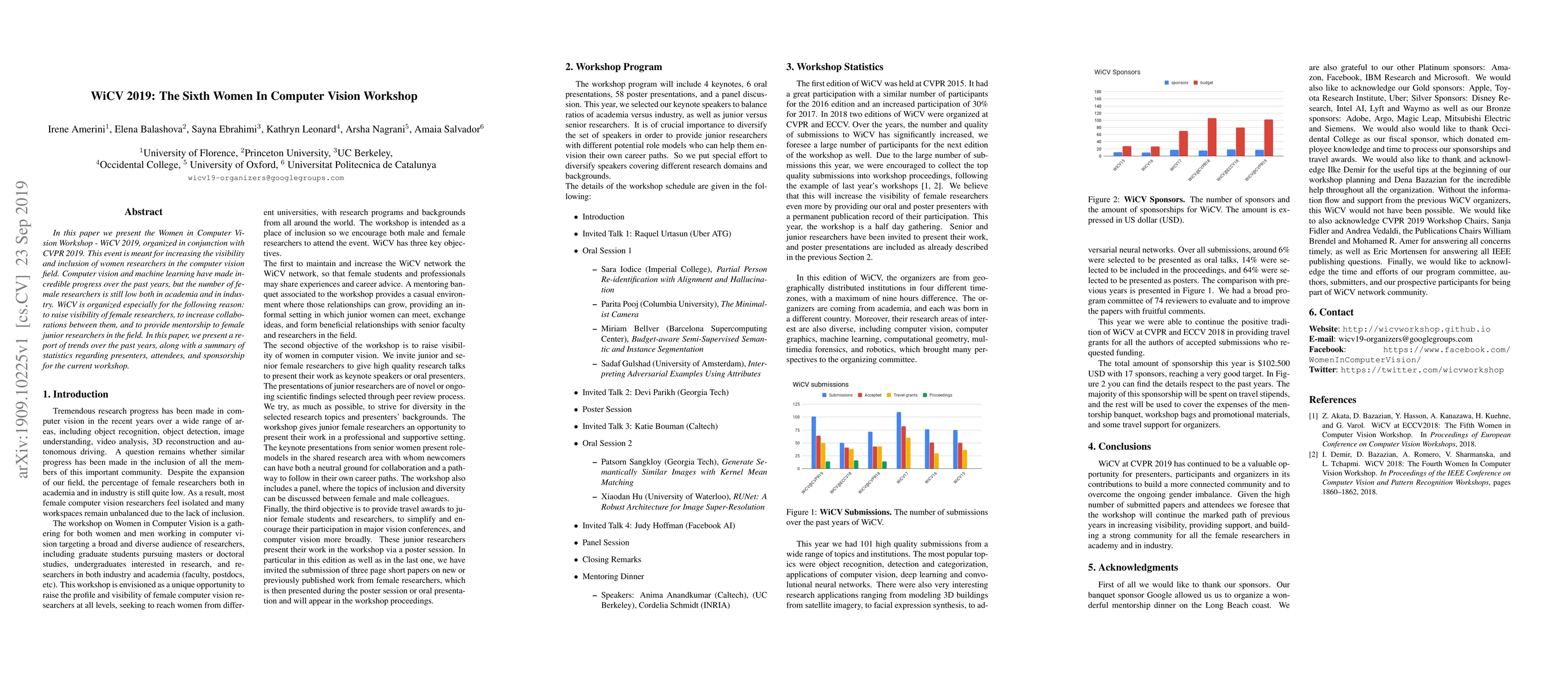 The WiCV 2019 workshop aims to boost visibility and inclusion of women in computer vision, reporting on trends and statistics from past years, including presenter, attendee, and sponsorship data. The event seeks to foster collaboration and mentorship for female researchers in the field.