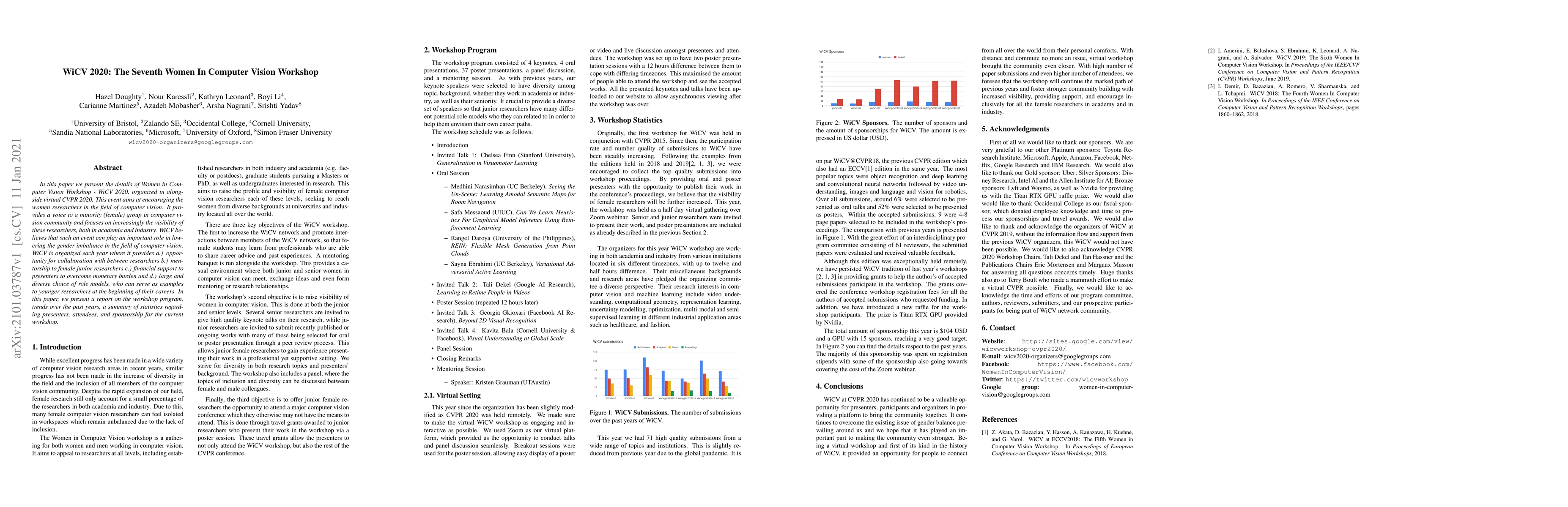 The WiCV 2020 workshop aims to boost gender diversity in computer vision by providing a platform for women researchers, including collaboration, mentorship, financial support, and role models. The paper reports on the workshop program, trends, and statistics from the event.
