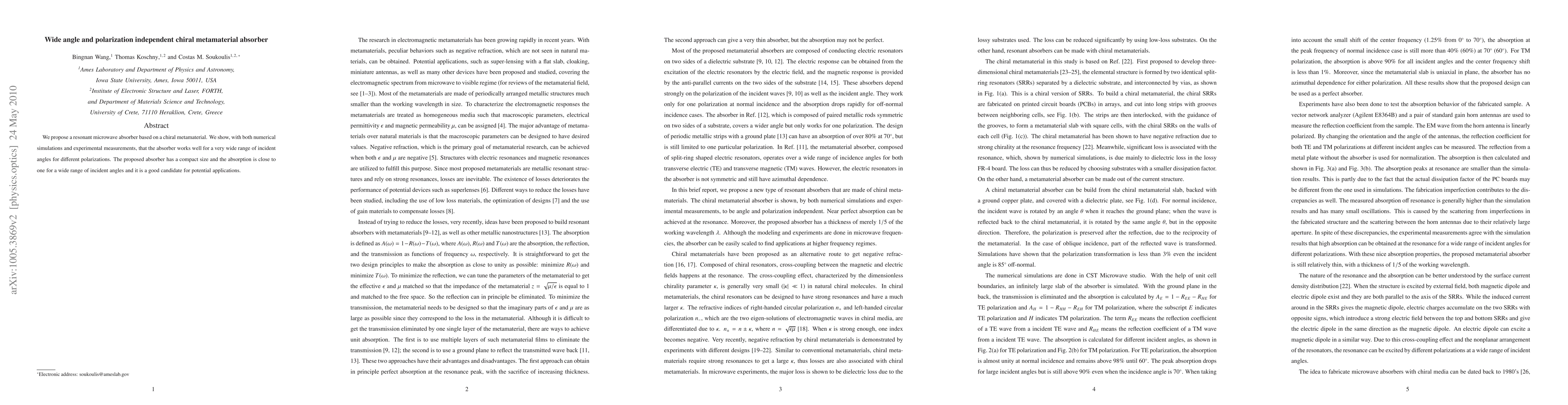 This paper proposes a compact chiral metamaterial microwave absorber that demonstrates wide-angle and polarization-independent absorption, validated through both simulations and experiments, making it a promising candidate for various applications.