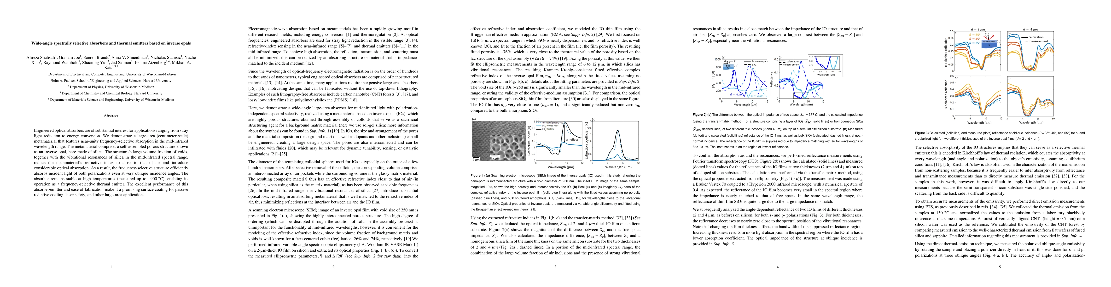 This paper presents a wide-angle spectrally selective absorber based on an inverse opal metamaterial made of silica, demonstrating near-unity absorption in the mid-infrared range. The structure's high void volume and silica resonances enable efficient absorption at oblique angles and high thermal stability, making it suitable for applications like passive radiative cooling and laser safety.