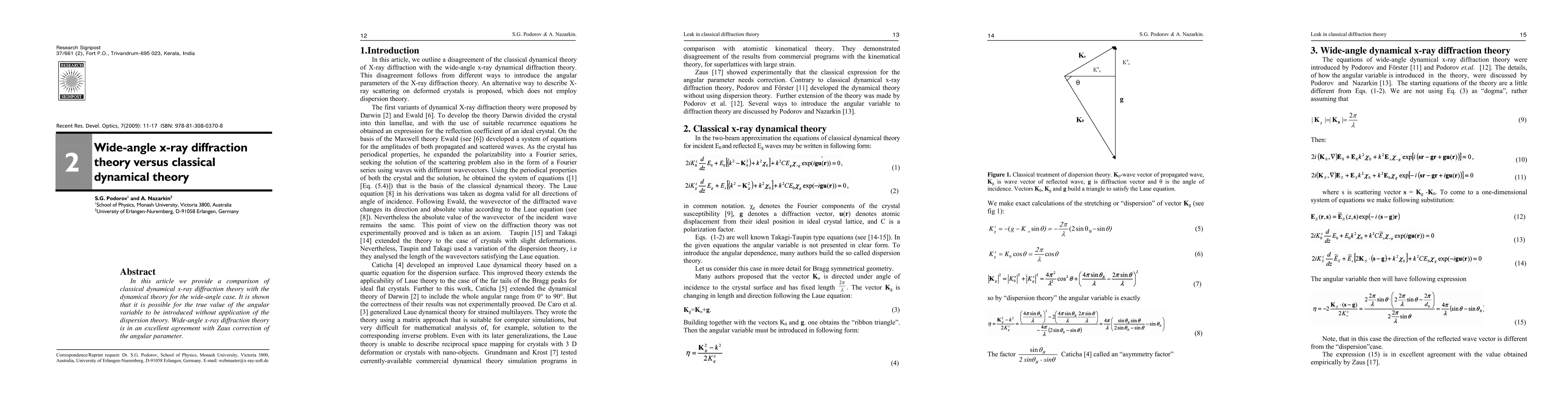This paper compares classical dynamical x-ray diffraction theory with its wide-angle counterpart, demonstrating that the true angular variable can be accurately determined without dispersion theory. It concludes that wide-angle x-ray diffraction theory aligns well with Zaus' correction of the angular parameter.