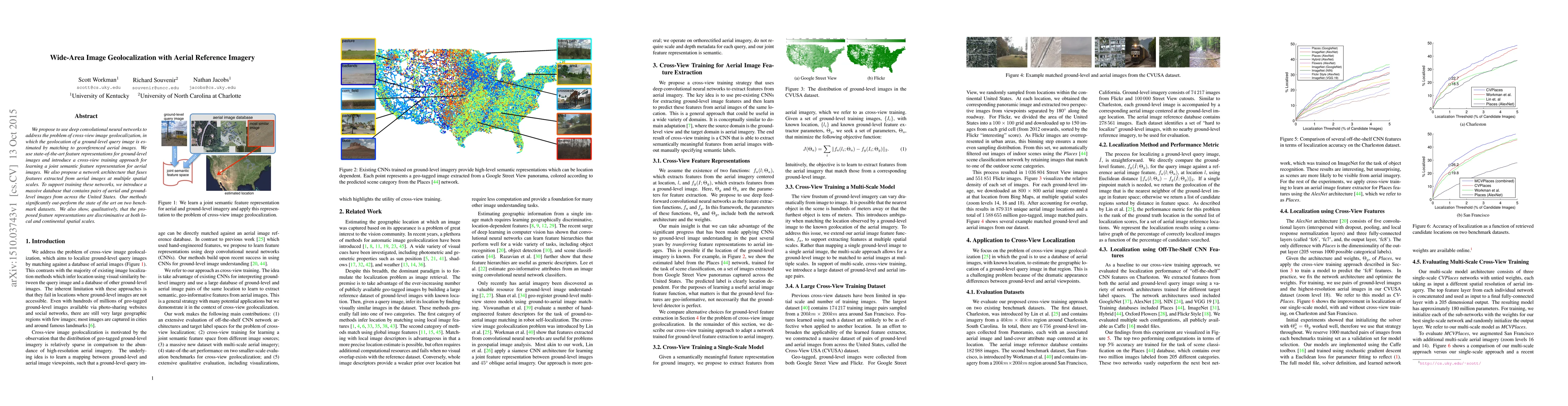 We propose to use deep convolutional neural networks to address the problem of cross-view image geolocalization, in which the geolocation of a ground-level query image is estimated by matching to georeferenced aerial images. We use state-of-the-art feature representations for ground-level images and introduce a cross-view training approach for learning a joint semantic feature representation for aerial images. We also propose a network architecture that fuses features extracted from aerial images at multiple spatial scales. To support training these networks, we introduce a massive database that contains pairs of aerial and ground-level images from across the United States. Our methods significantly out-perform the state of the art on two benchmark datasets. We also show, qualitatively, that the proposed feature representations are discriminative at both local and continental spatial scales.
