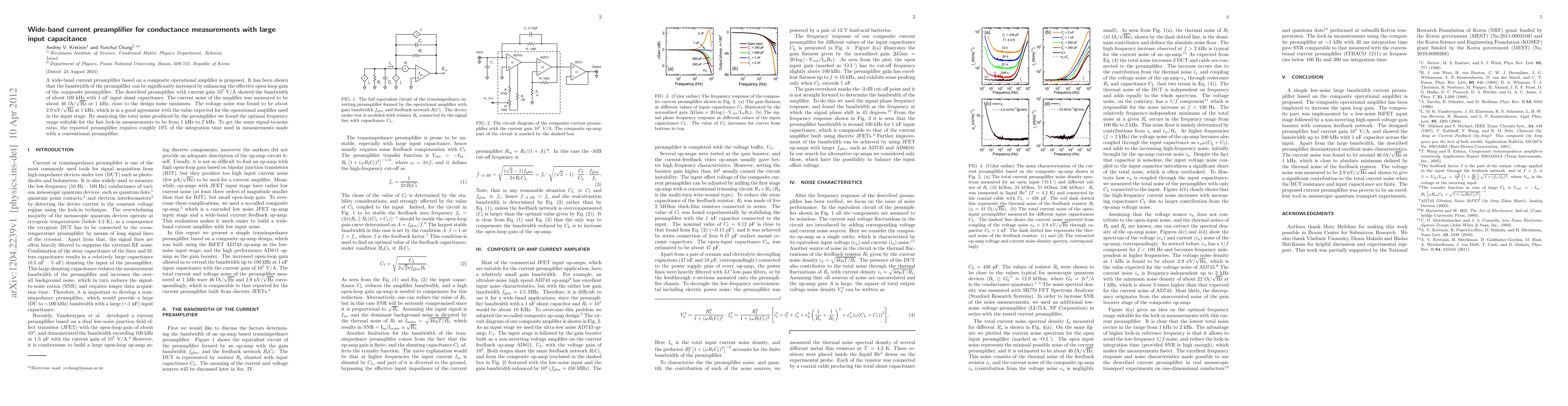 This paper proposes a wide-band current preamplifier using a composite operational amplifier, achieving a bandwidth of 100 kHz with a current gain of 10$^7$ V/A. The preamplifier exhibits low noise, making it optimal for fast lock-in measurements in the 1-2 kHz range.
