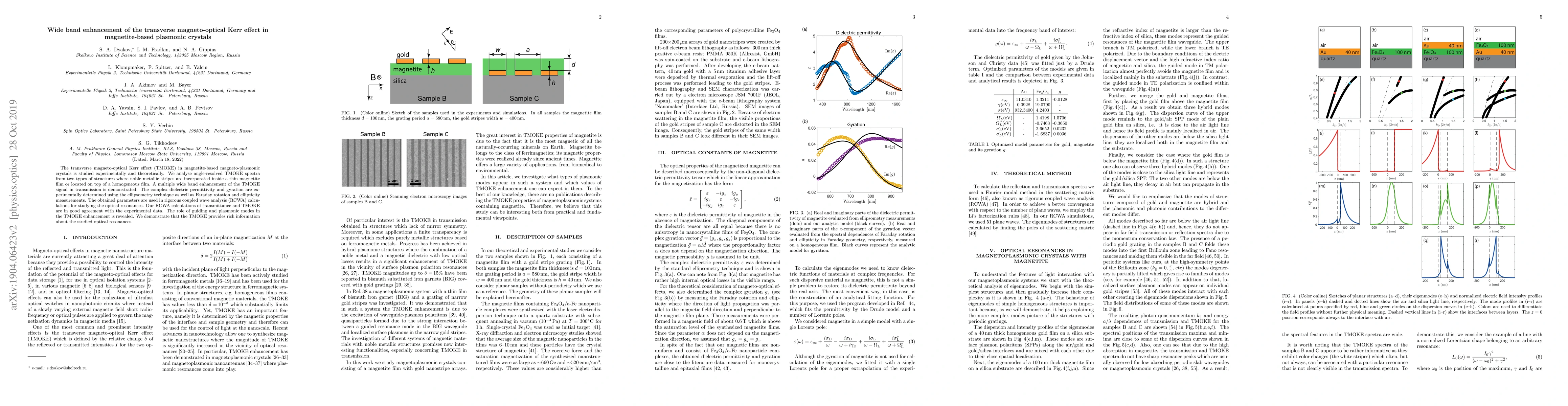 The transverse magneto-optical Kerr effect (TMOKE) in magnetite-based magneto-plasmonic crystals is studied experimentally and theoretically. We analyze angle-resolved TMOKE spectra from two types of structures where noble metallic stripes are incorporated inside a thin magnetite film or located on top of a homogeneous film. A multiple wide band enhancement of the TMOKE signal in transmission is demonstrated. The complex dielectric permittivity and gyration are experimentally determined using the ellipsometry technique as well as Faraday rotation and ellipticity measurements. The obtained parameters are used in rigorous coupled wave analysis (RCWA) calculations for studying the optical resonances. Our RCWA calculations of transmittance and TMOKE are in good agreement with the experimental data. The role of guiding and plasmonic modes in the TMOKE enhancement is revealed. We demonstrate that the TMOKE provides rich information about the studied optical resonances.