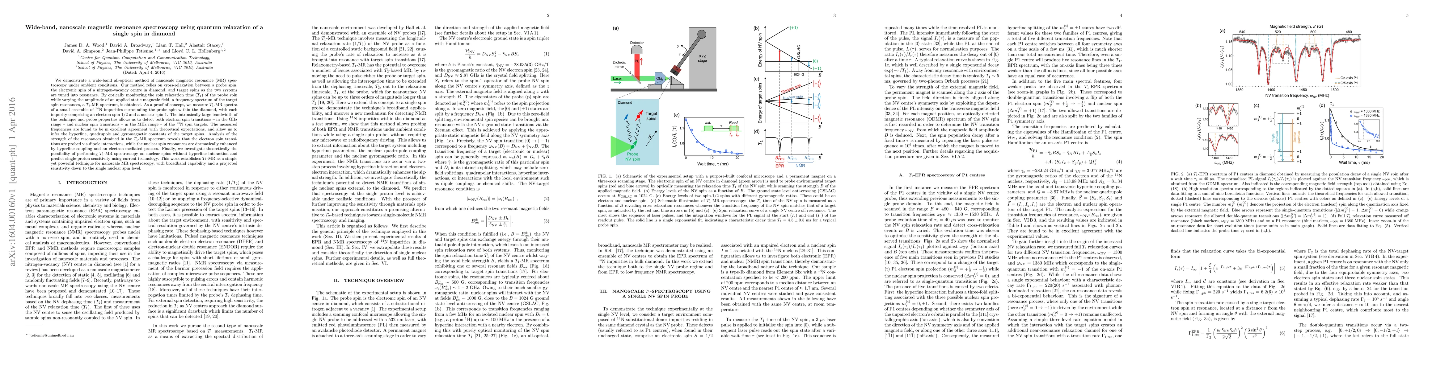 We demonstrate a wide-band all-optical method of nanoscale magnetic resonance (MR) spectroscopy under ambient conditions. Our method relies on cross-relaxation between a probe spin, the electronic spin of a nitrogen-vacancy centre in diamond, and target spins as the two systems are tuned into resonance. By optically monitoring the spin relaxation time ($T_1$) of the probe spin while varying the amplitude of an applied static magnetic field, a frequency spectrum of the target spin resonances, a $T_1$-MR spectrum, is obtained. As a proof of concept, we measure $T_1$-MR spectra of a small ensemble of $^{14}$N impurities surrounding the probe spin within the diamond, with each impurity comprising an electron spin 1/2 and a nuclear spin 1. The intrinsically large bandwidth of the technique and probe properties allows us to detect both electron spin transitions -- in the GHz range -- and nuclear spin transitions -- in the MHz range -- of the $^{14}$N spin targets. The measured frequencies are found to be in excellent agreement with theoretical expectations, and allow us to infer the hyperfine, quadrupole and gyromagnetic constants of the target spins. Analysis of the strength of the resonances obtained in the $T_1$-MR spectrum reveals that the electron spin transitions are probed via dipole interactions, while the nuclear spin resonances are dramatically enhanced by hyperfine coupling and an electron-mediated process. Finally, we investigate theoretically the possibility of performing $T_1$-MR spectroscopy on nuclear spins without hyperfine interaction and predict single-proton sensitivity using current technology. This work establishes $T_1$-MR as a simple yet powerful technique for nanoscale MR spectroscopy, with broadband capability and a projected sensitivity down to the single nuclear spin level.
