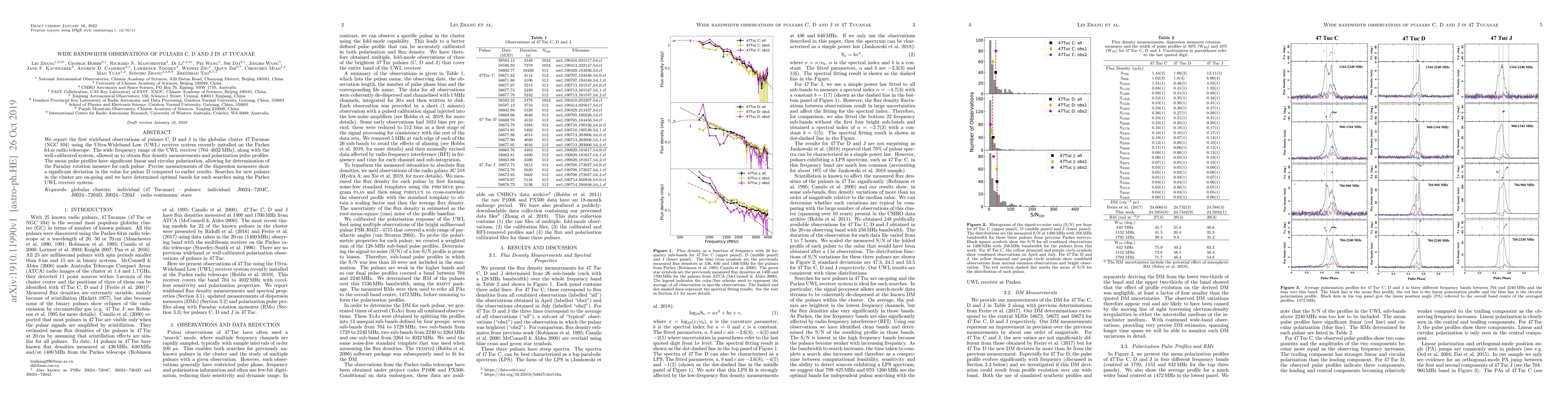 We report the first wideband observations of pulsars C, D and J in the globular cluster 47Tucanae (NGC 104) using the Ultra-Wideband Low (UWL) receiver system recently installed on the Parkes 64 m radio telescope. The wide frequency range of the UWL receiver (704-4032 MHz), along with the well-calibrated system, allowed us to obtain flux density measurements and polarization pulse profiles. The mean pulse profiles have significant linear and circular polarization, allowing for determination of the Faraday rotation measure for each pulsar. Precise measurements of the dispersion measures show a significant deviation in the value for pulsar D compared to earlier results. Searches for new pulsars in the cluster are on-going and we have determined optimal bands for such searches using the Parkes UWL receiver system.
