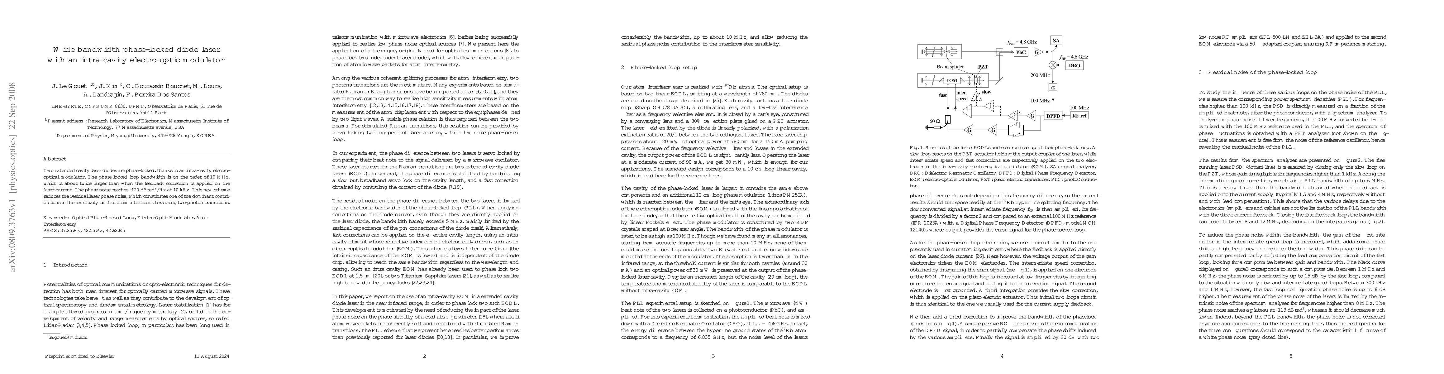 Two extended cavity laser diodes are phase-locked, thanks to an intra-cavity electro-optical modulator. The phase-locked loop bandwidth is on the order of 10 MHz, which is about twice larger than when the feedback correction is applied on the laser current. The phase noise reaches -120 dBrad$^2$/Hz at 10 kHz. This new scheme reduces the residual laser phase noise, which constitutes one of the dominant contributions in the sensitivity limit of atom interferometers using two-photon transitions.