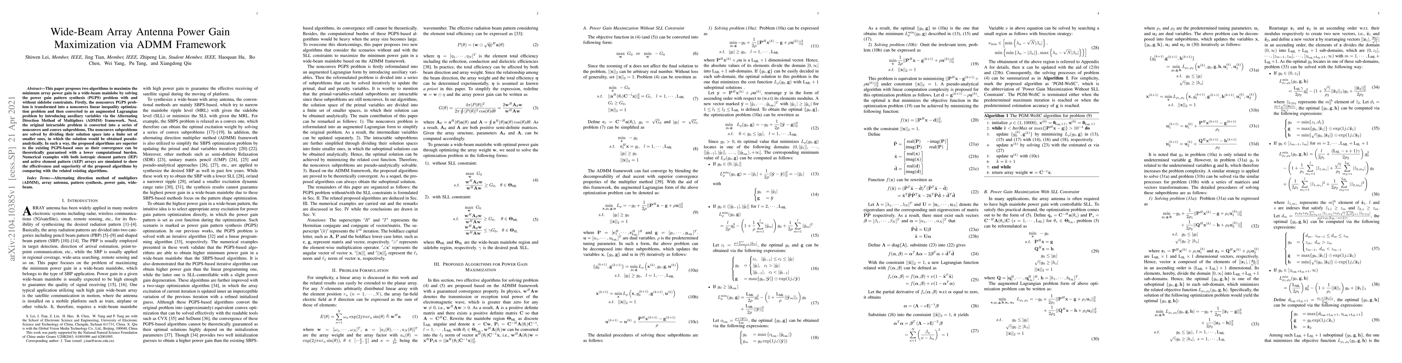 This paper proposes two algorithms using the ADMM framework to maximize the minimum array power gain in wide-beam antenna arrays, solving the nonconvex power gain pattern synthesis problem with and without sidelobe constraints, and demonstrating superior convergence and lower computational burden compared to existing methods. Numerical simulations validate the effectiveness of the proposed algorithms.