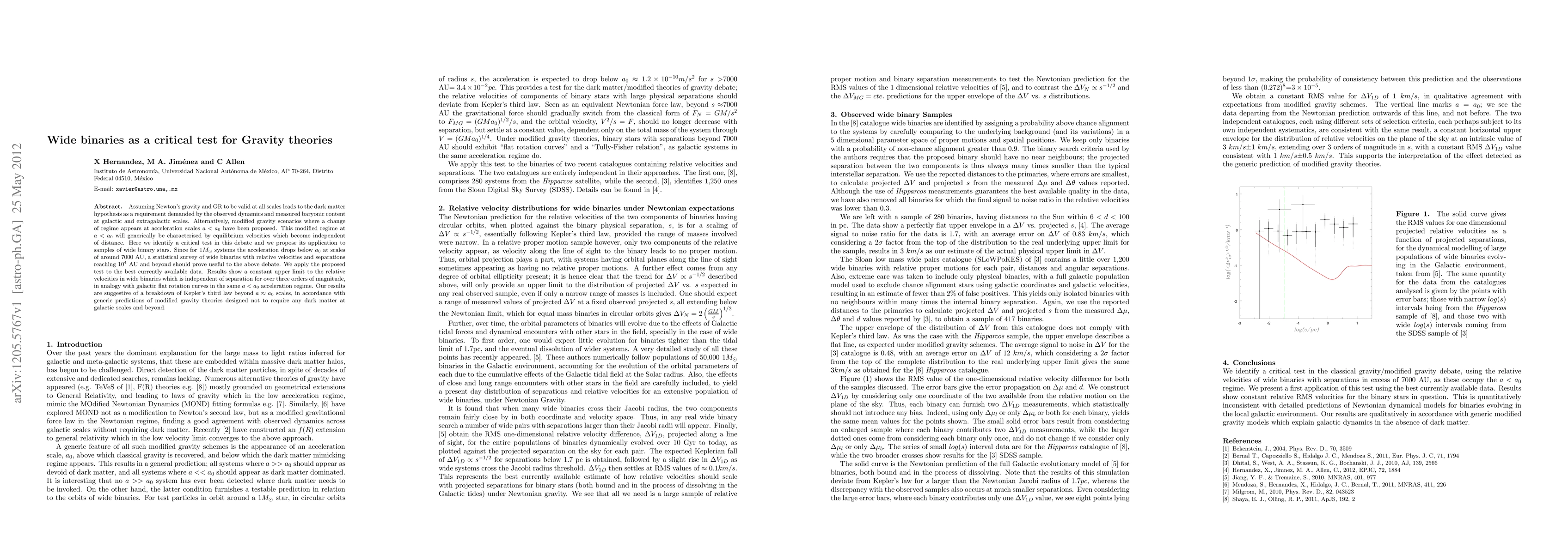 This paper proposes a critical test using wide binary stars to evaluate competing gravity theories, finding that relative velocities in these systems remain constant regardless of separation, supporting modified gravity models that avoid dark matter. The results suggest a deviation from Kepler's third law at low acceleration scales, aligning with modified gravity predictions.