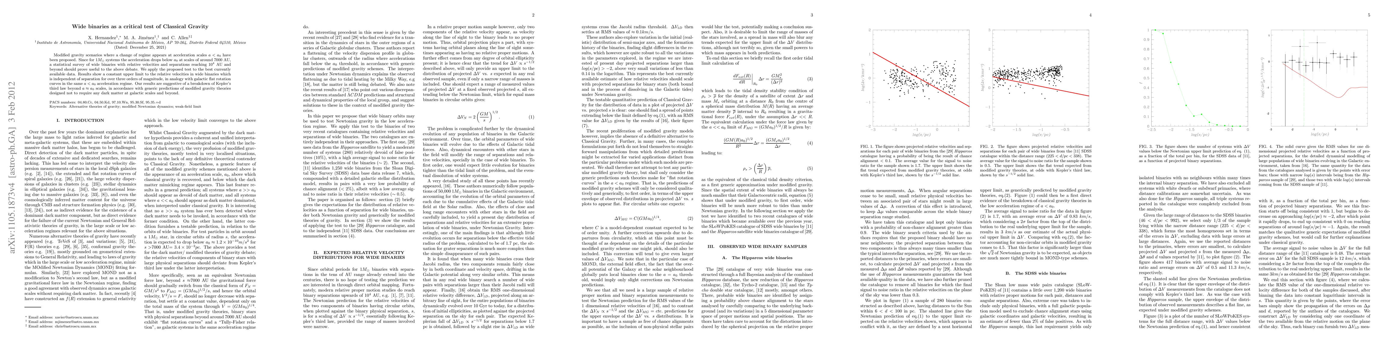 This paper investigates the behavior of wide binaries to test modified gravity theories, finding that relative velocities remain constant regardless of separation, suggesting a breakdown of Kepler's third law at certain scales and supporting modified gravity models that do not rely on dark matter.