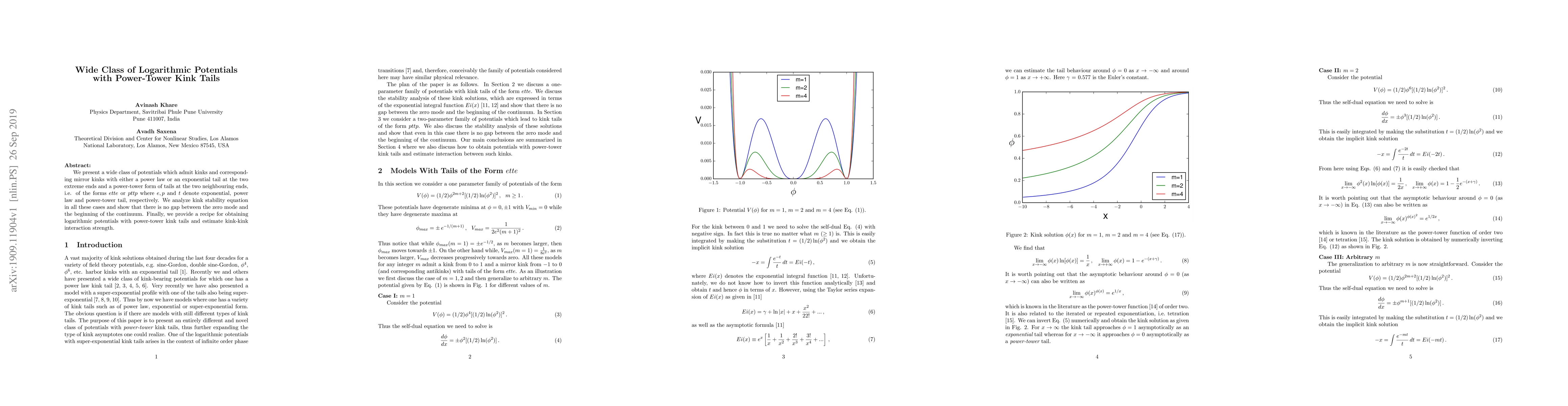 This paper introduces a broad category of logarithmic potentials featuring kinks with power-law or exponential tails at the extremes and power-tower tails in the middle. It analyzes kink stability and finds no gap between the zero mode and the continuum, while also providing a method for generating these potentials and estimating kink-kink interaction strength.