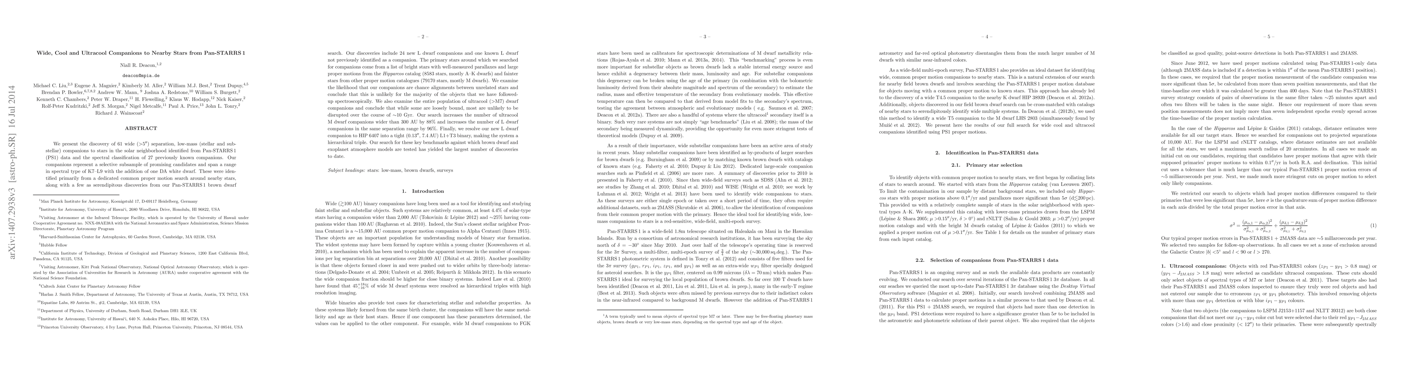 We present the discovery of 61 wide (>5 arcsecond) separation, low-mass (stellar and substellar) companions to stars in the solar neighborhood identified from Pan-STARRS\,1 (PS1) data and the spectral classification of 27 previously known companions. Our companions represent a selective subsample of promising candidates and span a range in spectral type of K7-L9 with the addition of one DA white dwarf. These were identified primarily from a dedicated common proper motion search around nearby stars, along with a few as serendipitous discoveries from our Pan-STARRS1 brown dwarf search. Our discoveries include 24 new L dwarf companions and one known L dwarf not previously identified as a companion. The primary stars around which we searched for companions come from a list of bright stars with well-measured parallaxes and large proper motions from the Hipparcos catalog (8583 stars, mostly A-K~dwarfs) and fainter stars from other proper motion catalogues (79170 stars, mostly M~dwarfs). We examine the likelihood that our companions are chance alignments between unrelated stars and conclude that this is unlikely for the majority of the objects that we have followed-up spectroscopically. We also examine the entire population of ultracool (>M7) dwarf companions and conclude that while some are loosely bound, most are unlikely to be disrupted over the course of $\sim$10 Gyr. Our search increases the number of ultracool M dwarf companions wider than 300 AU by 88% and increases the number of L dwarf companions in the same separation range by 96%. Finally, we resolve our new L dwarf companion to HIP 6407 into a tight (0.13 arcsecond, 7.4 AU) L1+T3 binary, making the system a hierarchical triple. Our search for these key benchmarks against which brown dwarf and exoplanet atmosphere models are tested has yielded the largest number of discoveries to date.