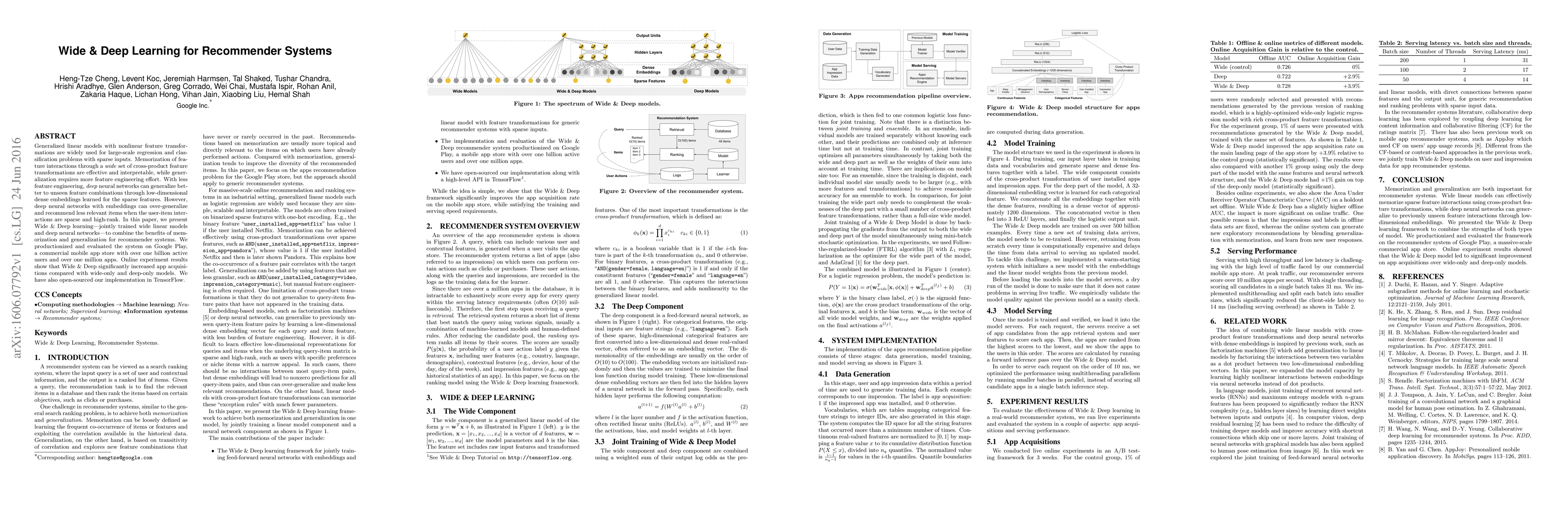 This paper introduces Wide & Deep learning, combining wide linear models and deep neural networks to leverage both memorization and generalization for recommender systems. The approach was productionized and tested on Google Play, showing significant improvements in app acquisitions compared to standalone models.