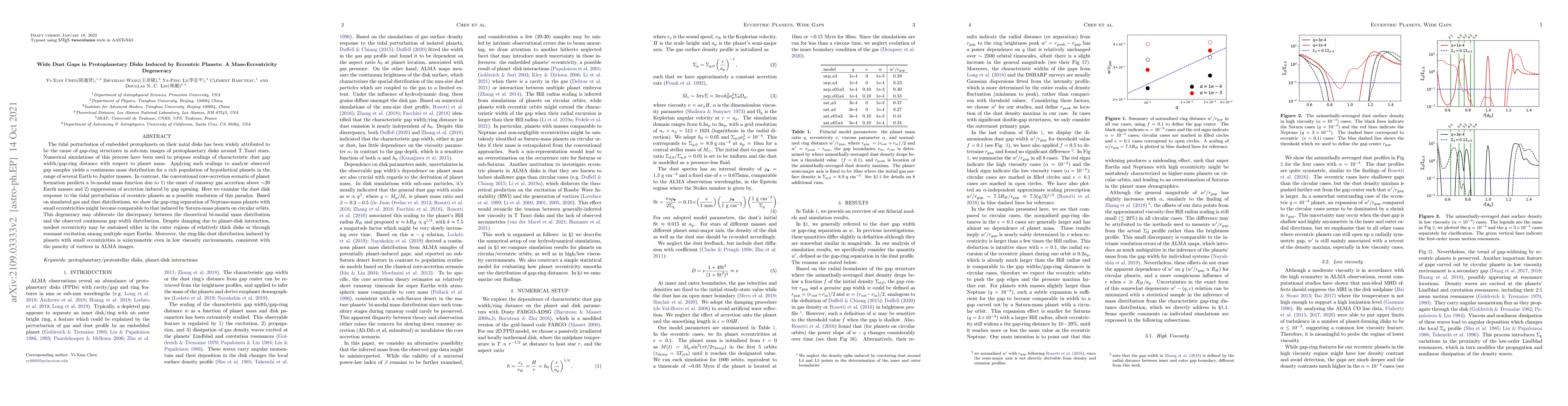 The tidal perturbation of embedded protoplanets on their natal disks has been widely attributed to be the cause of gap-ring structures in sub-mm images of protoplanetary disks around T Tauri stars. Numerical simulations of this process have been used to propose scalings of characteristic dust gap width/gap-ring distance with respect to planet mass. Applying such scalings to analyze observed gap samples yields a continuous mass distribution for a rich population of hypothetical planets in the range of several Earth to Jupiter masses. In contrast, the conventional core-accretion scenario of planet formation predicts a bi-modal mass function due to 1) the onset of runaway gas accretion above \sim20 Earth masses and 2) suppression of accretion induced by gap opening. Here we examine the dust disk response to the tidal perturbation of eccentric planets as a possible resolution of this paradox. Based on simulated gas and dust distributions, we show the gap-ring separation of Neptune-mass planets with small eccentricities might become comparable to that induced by Saturn-mass planets on circular orbits. This degeneracy may obliterate the discrepancy between the theoretical bi-modal mass distribution and the observed continuous gap width distribution. Despite damping due to planet-disk interaction, modest eccentricity may be sustained either in the outer regions of relatively thick disks or through resonant excitation among multiple super Earths. Moreover, the ring-like dust distribution induced by planets with small eccentricities is axisymmetric even in low viscosity environments, consistent with the paucity of vortices in ALMA images.