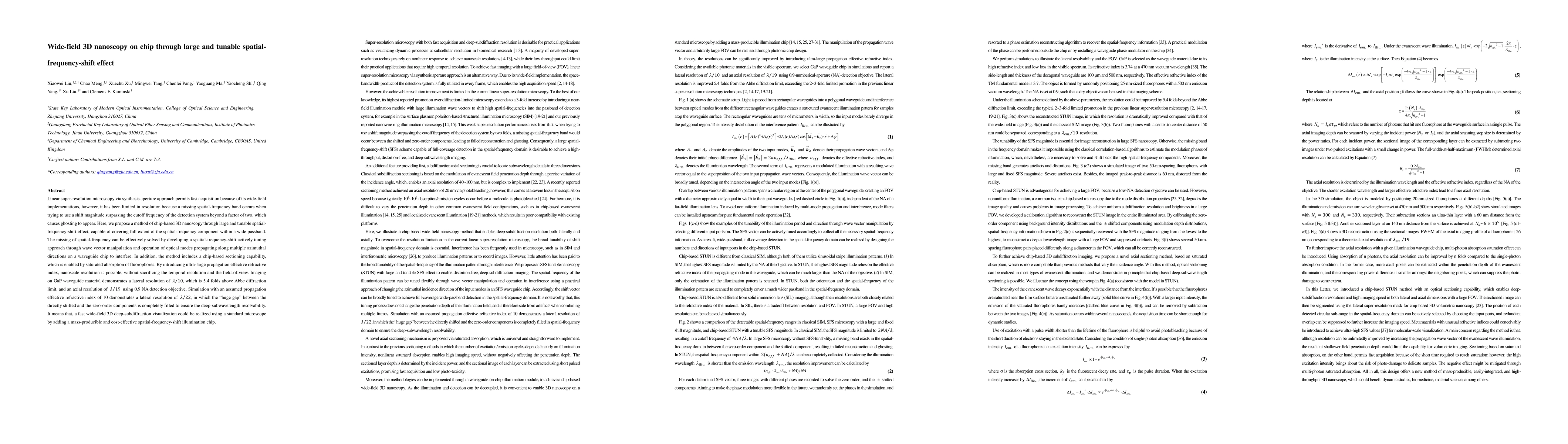This paper proposes a chip-based 3D nanoscopy method using a tunable spatial-frequency-shift effect to overcome resolution limitations in wide-field super-resolution microscopy. The method achieves nanoscale resolution without sacrificing temporal resolution or field-of-view, demonstrating lateral resolution five times above the Abbe limit and axial resolution using GaP waveguide material.