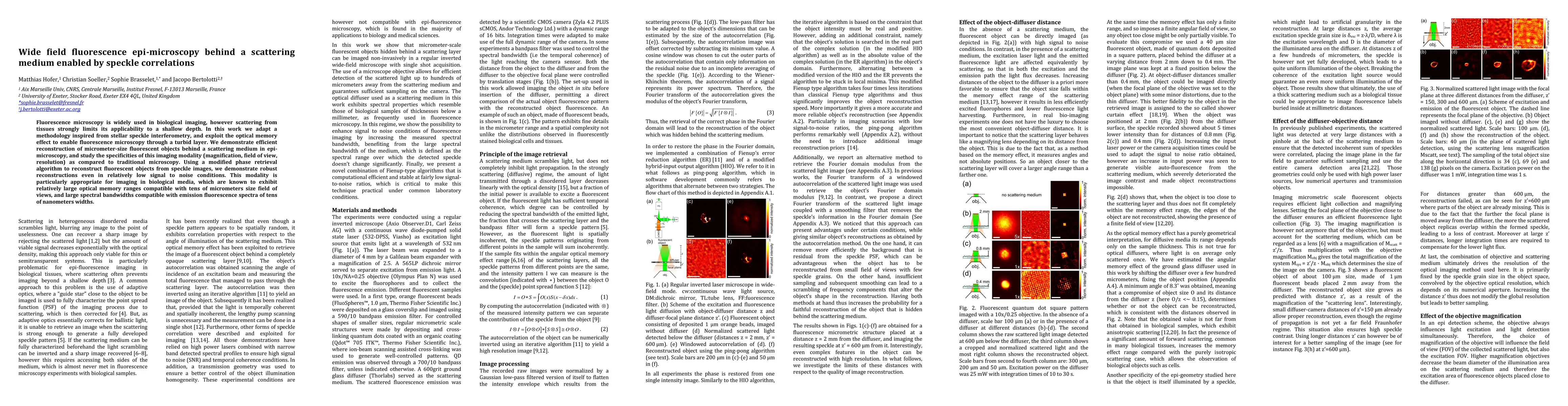 The research introduces a novel method for fluorescence microscopy through scattering media, utilizing speckle correlations and phase retrieval algorithms to reconstruct micrometer-sized objects from single intensity images of scattered light.