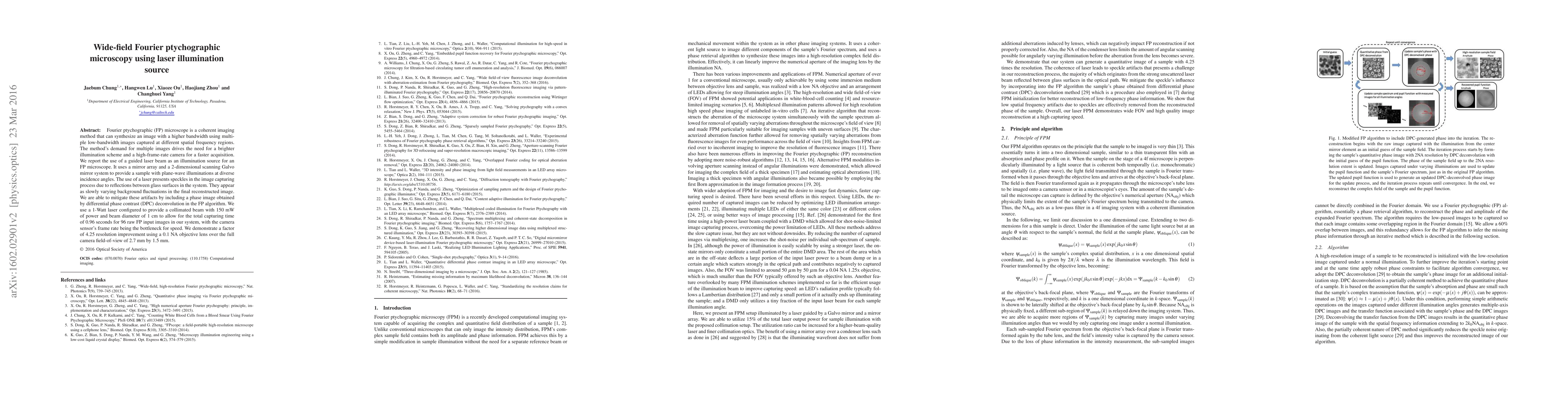 Fourier ptychographic (FP) microscope is a coherent imaging method that can synthesize an image with a higher bandwidth using multiple low-bandwidth images captured at different spatial frequency regions. The method's demand for multiple images drives the need for a brighter illumination scheme and a high-frame-rate camera for a faster acquisition. We report the use of a guided laser beam as an illumination source for an FP microscope. It uses a mirror array and a 2-dimensional scanning Galvo mirror system to provide a sample with plane-wave illuminations at diverse incidence angles. The use of a laser presents speckles in the image capturing process due to reflections between glass surfaces in the system. They appear as slowly varying background fluctuations in the final reconstructed image. We are able to mitigate these artifacts by including a phase image obtained by differential phase contrast (DPC) deconvolution in the FP algorithm. We use a 1-Watt laser configured to provide a collimated beam with 150 mW of power and beam diameter of 1 cm to allow for the total capturing time of 0.96 seconds for 96 raw FP input images in our system, with the camera sensor's frame rate being the bottleneck for speed. We demonstrate a factor of 4.25 resolution improvement using a 0.1 NA objective lens over the full camera field-of-view of 2.7 mm by 1.5 mm.