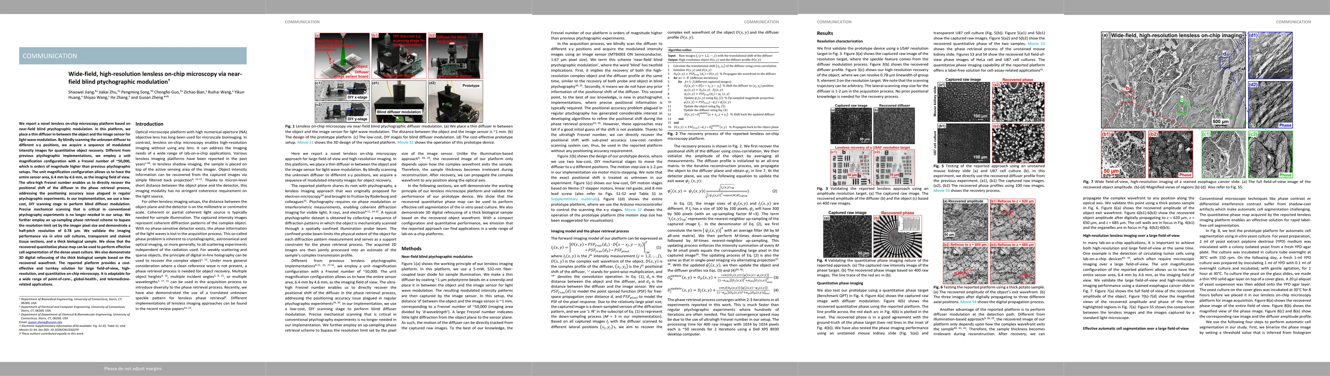 Researchers developed a cost-effective lensless microscopy platform using near-field blind ptychographic modulation, achieving high-resolution imaging with a field of view of 6.4mm x 4.6mm and resolving details as small as 0.78 microns.