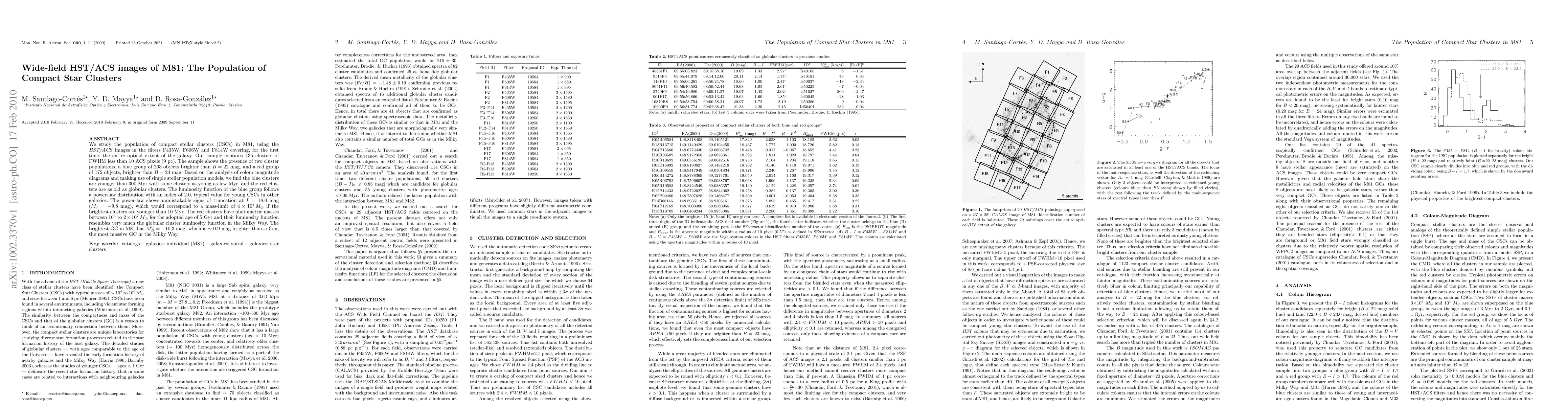 We study the population of compact stellar clusters (CSCs) in M81, using the HST/ACS images in the filters F435W, F606W and F814W covering, for the first time, the entire optical extent of the galaxy. Our sample contains 435 clusters of FWHM less than 10 ACS pixels (9 pc). The sample shows the presence of two cluster populations, a blue group of 263 objects brighter than B=22 mag, and a red group of 172 objects, brighter than B=24 mag. Based on the analysis of colour magnitude diagrams and making use of simple stellar population models, we find the blue clusters are younger than 300 Myr with some clusters as young as few Myr, and the red clusters are as old as globular clusters. The luminosity function of the blue group follows a power-law distribution with an index of 2.0, typical value for young CSCs in other galaxies. The power-law shows unmistakable signs of truncation at I=18.0 mag (M_I=-9.8 mag), which would correspond to a mass-limit of 4x10^4 M_solar if the brightest clusters are younger than 10 Myr. The red clusters have photometric masses between 10^5 to 2x10^7 M_solar for the adopted age of 5 Gyr and their luminosity function resembles very much the globular cluster luminosity function in the Milky Way. The brightest GC in M81 has M_B^0=-10.3 mag, which is ~0.9 mag brighter than w-Cen, the most massive GC in the Milky Way.