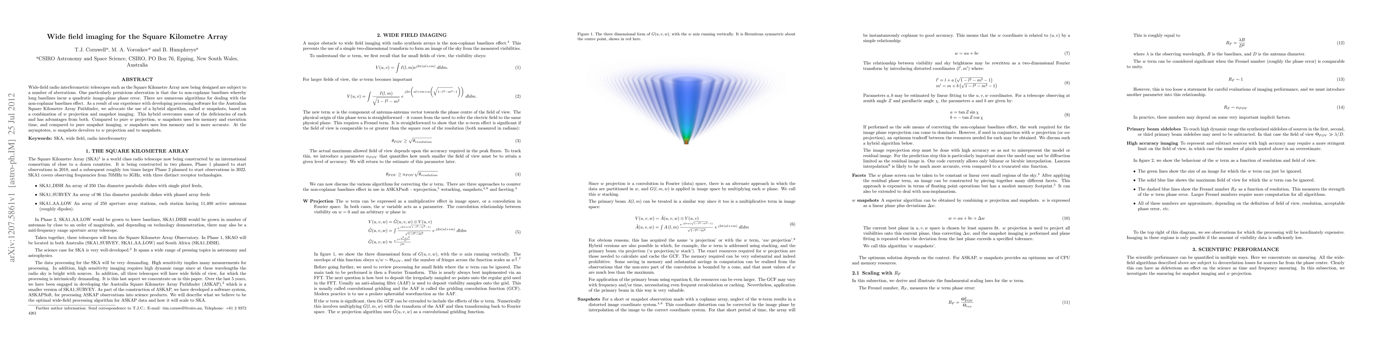 This paper discusses the challenges of aberrations in wide-field radio interferometric telescopes, particularly non-coplanar baselines, and proposes a hybrid algorithm called w snapshots. This method combines the benefits of w projection and snapshot imaging, offering reduced memory usage and execution time compared to pure w projection, and greater accuracy than pure snapshot imaging.