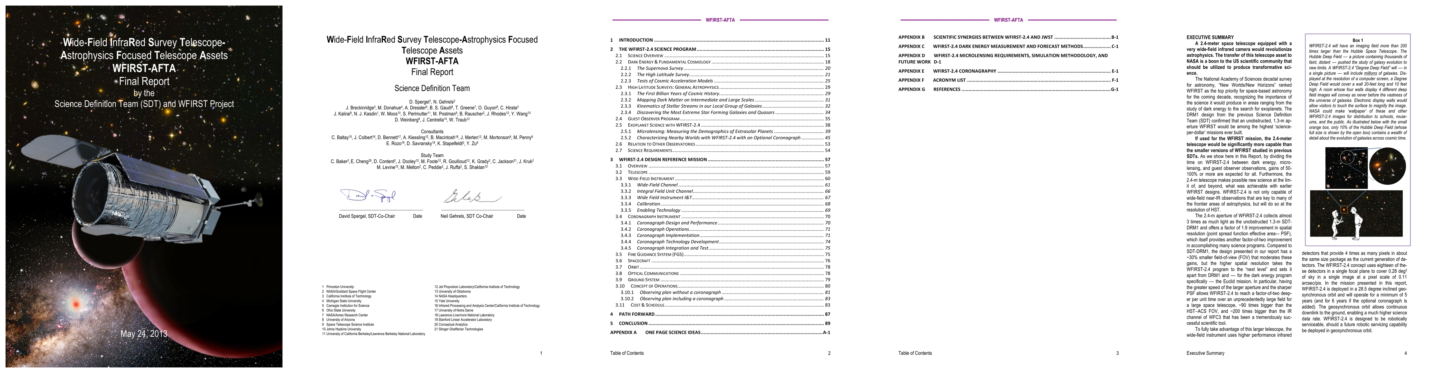 The WFIRST-AFTA mission, recommended by the Astro2010 Decadal Survey, aims to conduct a dark energy science program, exoplanet microlensing studies, and general observations using a 2.4-m Hubble-quality mirror. The final report details the Design Reference Mission, enhancing sensitivity and resolution, and explores the potential for a coronagraphic instrument for exoplanet imaging.