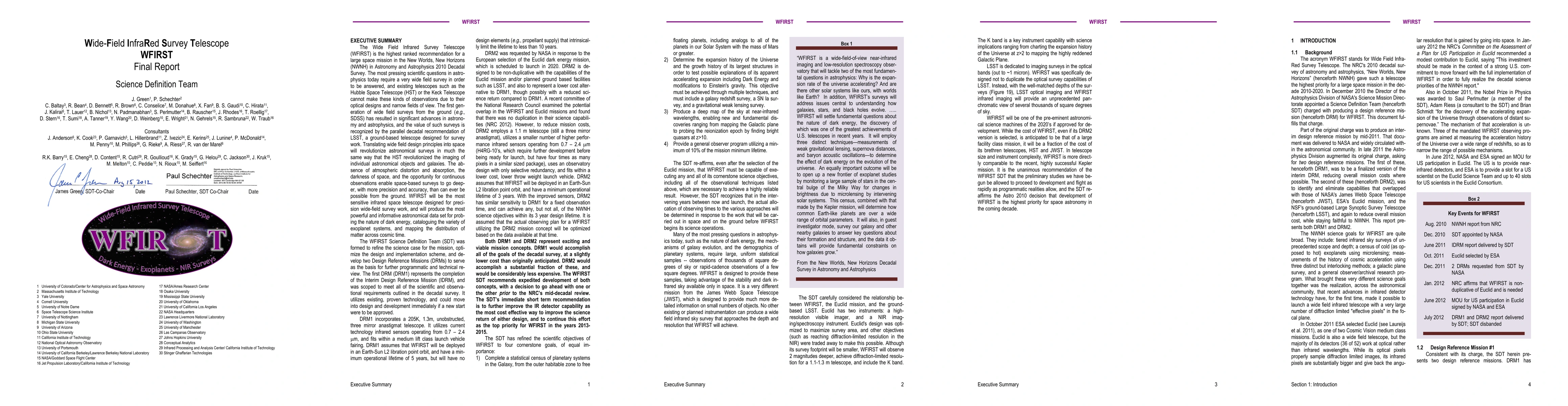 The WFIRST Final Report details NASA's Science Definition Team's efforts to develop two design reference missions for the Wide Field Infra-Red Survey Telescope, aiming to optimize cost and avoid overlap with other major space and ground-based observatories. The report presents both a finalized interim design and a refined version that minimizes redundancy with existing and planned missions.