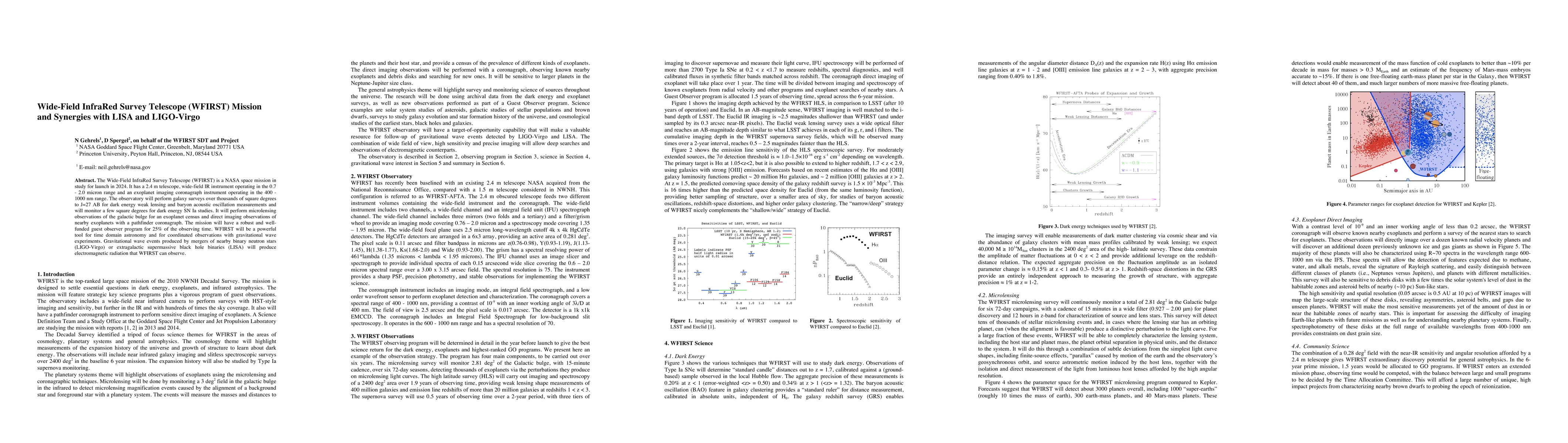 The WFIRST mission, a NASA space telescope set for launch in 2024, aims to conduct galaxy surveys and exoplanet studies through wide-field infrared and direct imaging observations. It will synergize with gravitational wave experiments like LIGO-Virgo and LISA to observe electromagnetic radiation from gravitational wave events.
