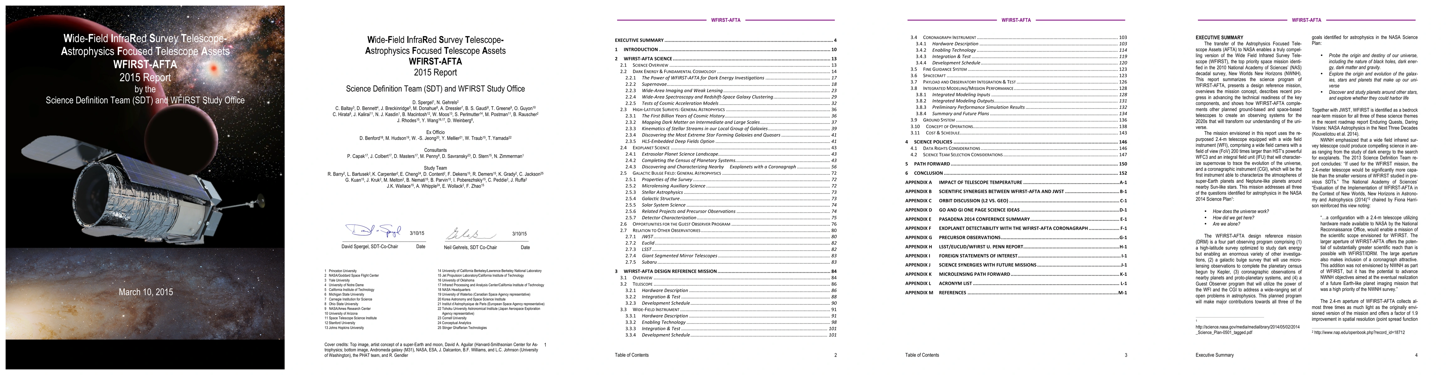 This report outlines the 2014 study of the Wide-Field Infrared Survey Telescope (WFIRST) mission, focusing on dark energy, exoplanets, and general astrophysics. The 2.4-m telescope, equipped with a wide-field infrared instrument and an optical coronagraph, aims to enhance scientific exploration and enable the study of exoplanets through microlensing.