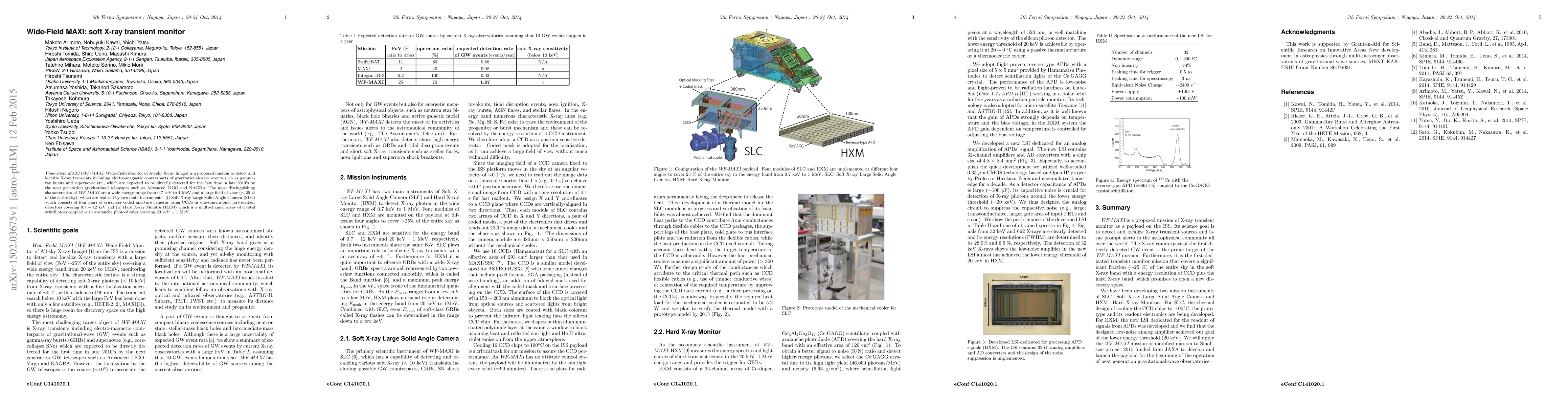 Wide-Field MAXI (WF-MAXI: Wide-Field Monitor of All-sky X-ray Image) is a proposed mission to detect and localize X-ray transients including electro-magnetic counterparts of gravitational-wave events such as gamma-ray bursts and supernovae etc., which are expected to be directly detected for the first time in late 2010's by the next generation gravitational telescopes such as Advanced LIGO and KAGRA. The most distinguishing characteristics of WF-MAXI are a wide energy range from 0.7 keV to 1 MeV and a large field of view (~25 % of the entire sky), which are realized by two main instruments: (i) Soft X-ray Large Solid Angle Camera (SLC) which consists of four pairs of crisscross coded aperture cameras using CCDs as one-dimensional fast-readout detectors covering 0.7 - 12 keV and (ii) Hard X-ray Monitor (HXM) which is a multi-channel array of crystal scintillators coupled with avalanche photo-diodes covering 20 keV - 1 MeV.