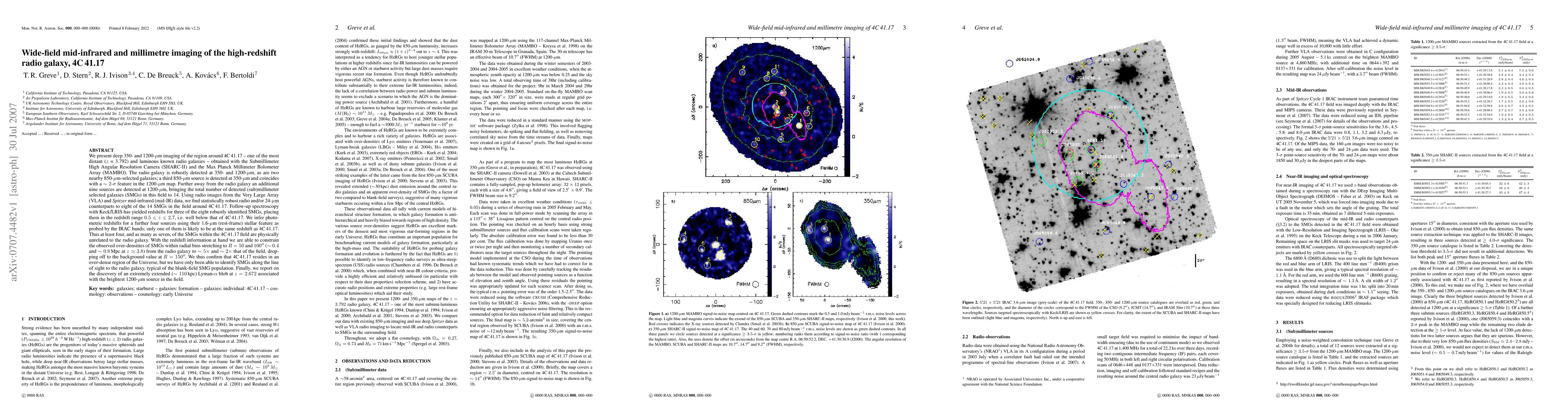 We present deep 350- and 1200-micron imaging of the region around 4C41.17 -- one of the most distant (z = 3.792) and luminous known radio galaxies -- obtained with the Submillimeter High Angular Resolution Camera (SHARC-II) and the Max Planck Millimeter Bolometer Array (MAMBO). The radio galaxy is robustly detected at 350- and 1200-micron, as are two nearby 850-micron-selected galaxies; a third 850-micron source is detected at 350-micron and coincides with a ~ 2-sigma feature in the 1200-micron map. Further away from the radio galaxy an additional nine sources are detected at 1200-micron, bringing the total number of detected (sub)millimeter selected galaxies (SMGs) in this field to 14. Using radio images from the Very Large Array (VLA) and Spitzer mid-infrared (mid-IR) data, we find statistically robust radio and/or 24-micron counterparts to eight of the 14 SMGs in the field around 4C41.17. Follow-up spectroscopy with Keck/LRIS has yielded redshifts for three of the eight robustly identified SMGs, placing them in the redshift range 0.5 < z < 2.7, i.e. well below that of 4C41.17. We infer photometric redshifts for a further four sources using their 1.6-micron (rest-frame) stellar feature as probed by the IRAC bands; only one of them is likely to be at the same redshift as 4C41.17. Thus at least four, and as many as seven, of the SMGs within the 4C41.17 field are physically unrelated to the radio galaxy. With the redshift information at hand we are able to constrain the observed over-densities of SMGs within radial bins stretching to R=50 and 100" (~ 0.4 and ~ 0.8Mpc at z ~ 3.8) from the radio galaxy to ~ 5x and ~ 2x that of the field, dropping off to the background value at R=150". [Abridged]