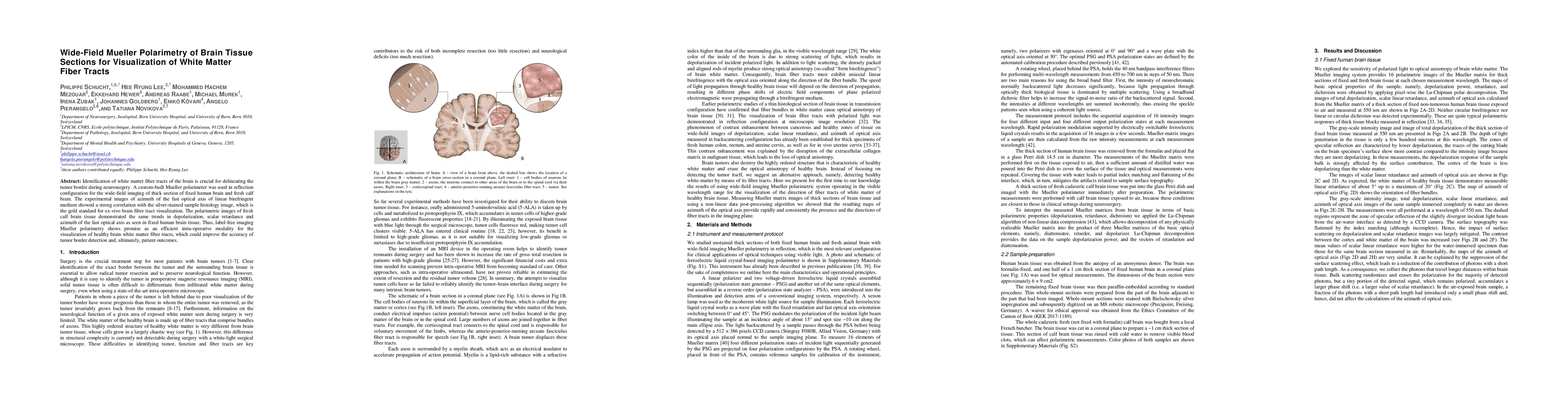 This study employs wide-field Mueller polarimetry to visualize white matter fiber tracts in brain tissue sections, demonstrating strong correlation with histological standards. The technique shows promise for improving the accuracy of tumor border detection during neurosurgery.