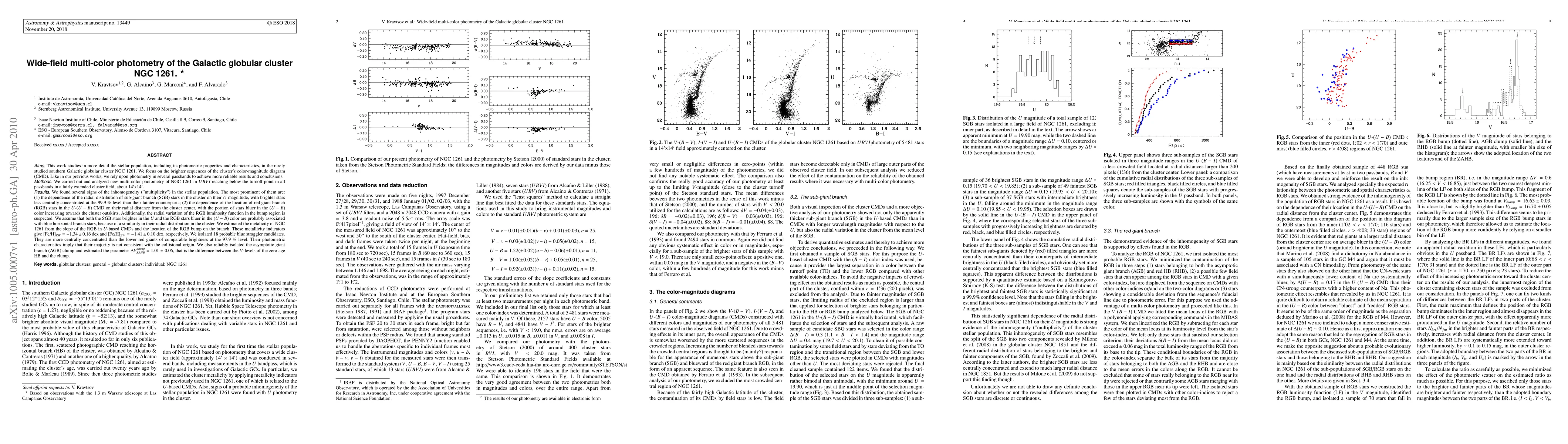 Researchers studied the Galactic globular cluster NGC 1261 using multi-color photometry, finding signs of inhomogeneity in its stellar population, including a radial distribution pattern for sub-giant branch stars and blue giant branch stars.