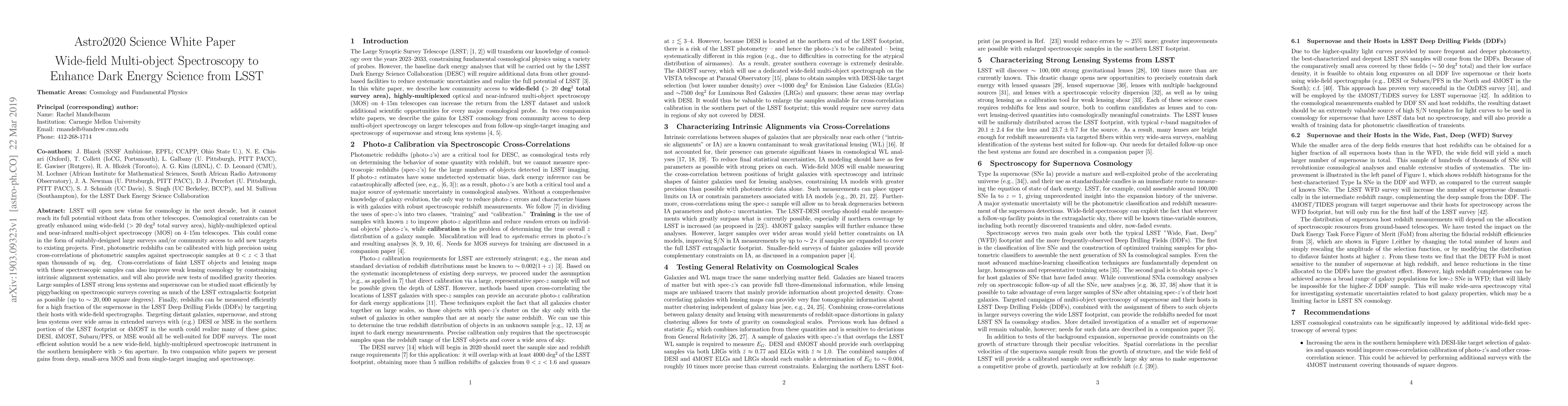 This paper discusses how wide-field multi-object spectroscopy (MOS) on large telescopes can enhance the cosmological insights from the Large Synoptic Survey Telescope (LSST) by providing precise redshifts and improving weak lensing studies, thus unlocking new avenues in dark energy science. The proposed solutions include leveraging existing surveys and developing new wide-field MOS instruments.