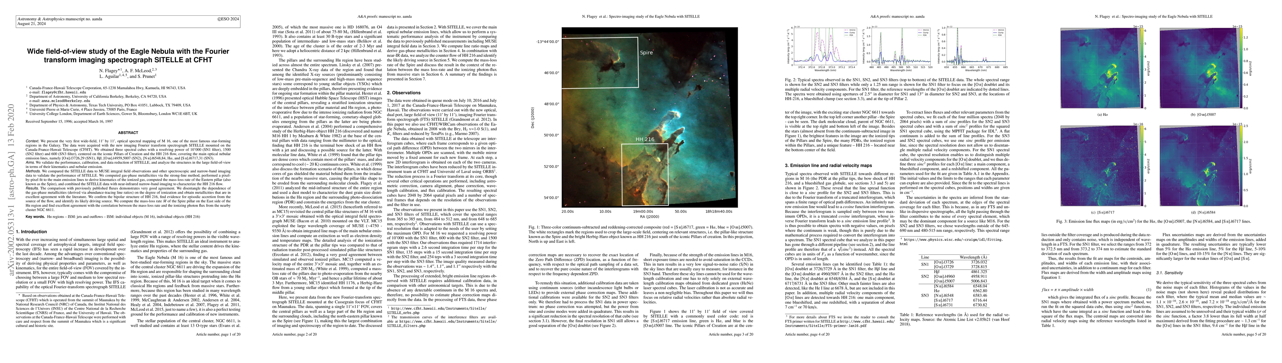 We present the very first wide-field, 11 by 11 arcmin, optical spectral mapping of M16, one of the most famous star-forming regions in the Galaxy. The data were acquired with the new imaging Fourier transform spectrograph SITELLE mounted on the Canada-France-Hawaii Telescope (CFHT). We obtained three spectral cubes with R=10'000 (SN1 filter), 1500 (SN2 filter) and 600 (SN3 filter), centered on the Pillars of Creation and the HH216 flow, covering the main optical nebular emission lines: [O II]3726,29 (SN1), Hb, [O III]4959,5007 (SN2), [N II]6548,84, Ha, and [S II]6717,31 (SN3). We validate the performance, calibration, and data reduction of SITELLE, and analyze the structures in the large field-of-view in terms of their kinematics and nebular emission. We compared the SITELLE data to MUSE integral field observations and other spectroscopic and narrow-band imaging data to validate the performance of SITELLE. We computed gas-phase metallicities via the strong-line method, performed a pixel-by-pixel fit to the main emission lines to derive kinematics of the ionized gas, computed the mass-loss rate of the Eastern pillar (the Spire), and combined the SITELLE data with near-infrared narrow-band imaging to characterize the HH216 flow. The comparison with previously published fluxes demonstrates very good agreement. We disentangle the dependence of the gas-phase metallicities (derived via abundance-tracing line ratios) on the degree of ionization and obtain metallicities that are in excellent agreement with the literature. We confirm the bipolar structure of HH216, find evidence for episodic accretion from the source of the flow, and identify its likely driving source. We compute the mass-loss rate of the Spire pillar on the East side of the H II region and find excellent agreement with the correlation between the mass-loss rate and the ionizing photon flux from the nearby cluster NGC6611.
