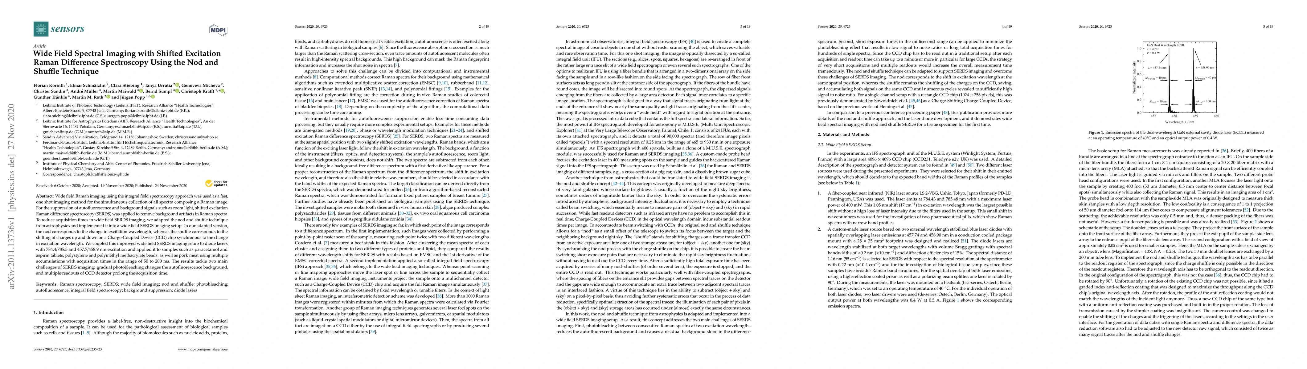 This paper presents a fast wide field Raman imaging method using shifted excitation Raman difference spectroscopy (SERDS) and the nod and shuffle technique to reduce acquisition times and suppress autofluorescence. The technique was applied to various samples, demonstrating its effectiveness in overcoming photobleaching and minimizing long acquisition times.