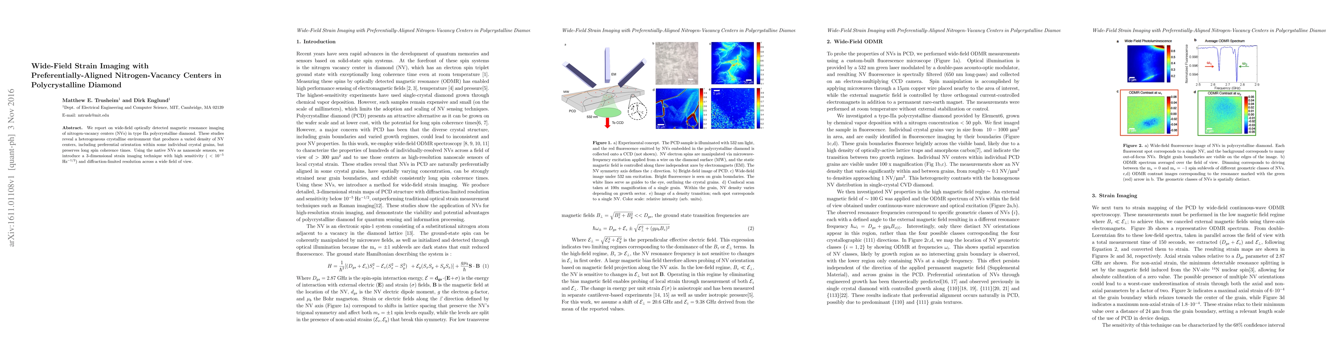 This paper presents a wide-field strain imaging technique using optically detected magnetic resonance of NV centers in polycrystalline diamond, revealing a heterogeneous crystalline environment with long spin coherence times and high sensitivity for 3D strain imaging. The method leverages the preferential alignment of NV centers for diffraction-limited resolution across a broad field of view.